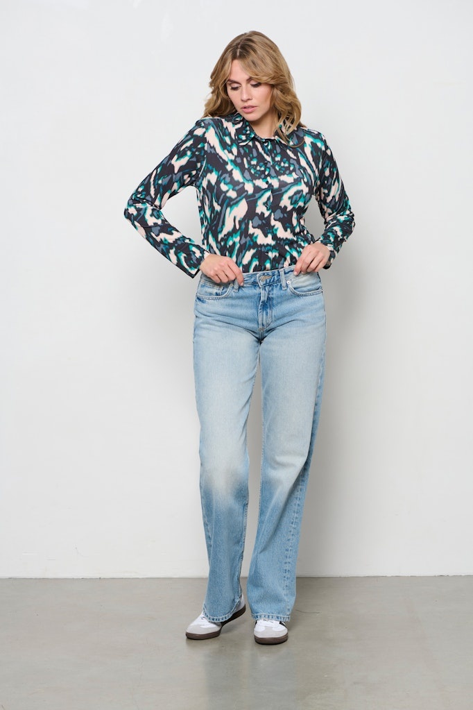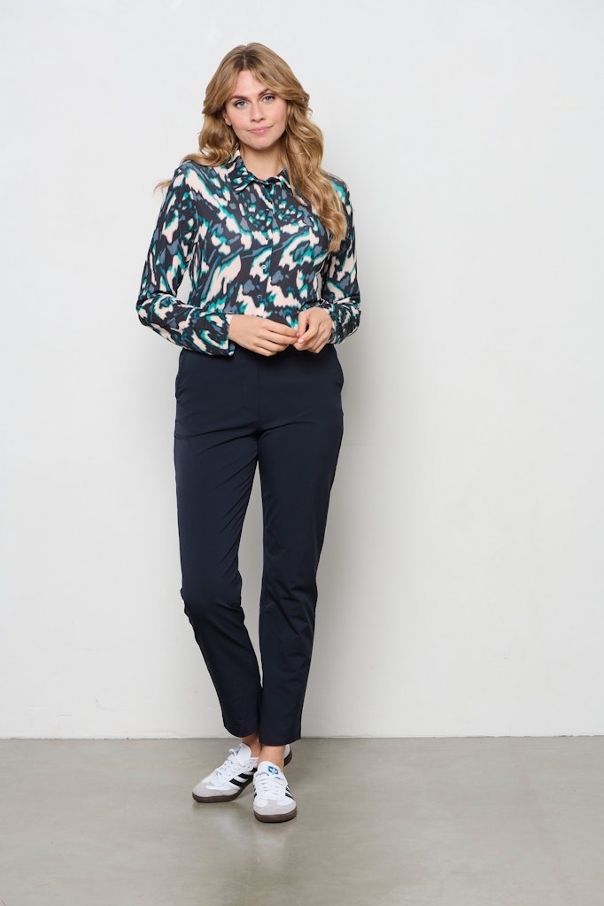 &Co Woman Blouse in het Zwart/Smargadgroen/Offwhite Combinatie met kraag, knoopsluiting en lange mouwen.