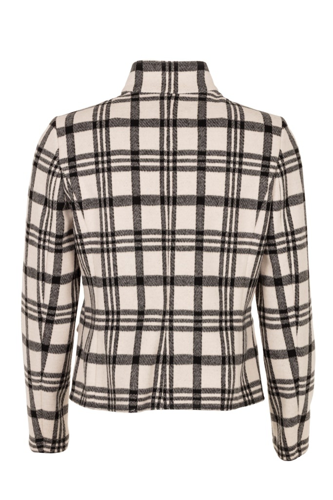 B Three Jasje in het Offwhite/Zwart geruit met staande kraag, knoopssluiting en lange mouwen. Deze jasjes zijn ongevoerd en makkelijk draagbaar.