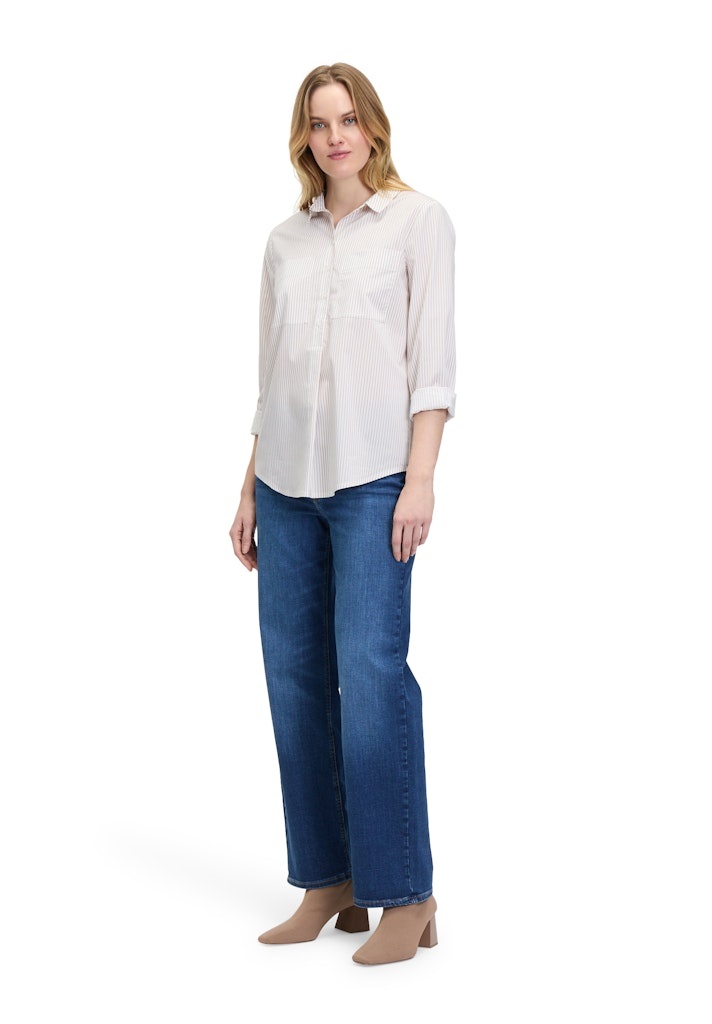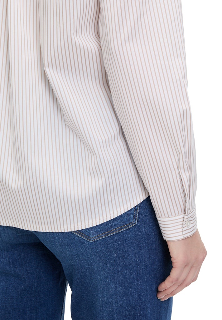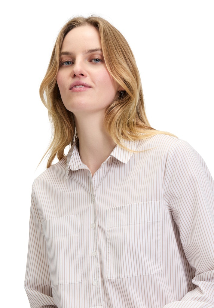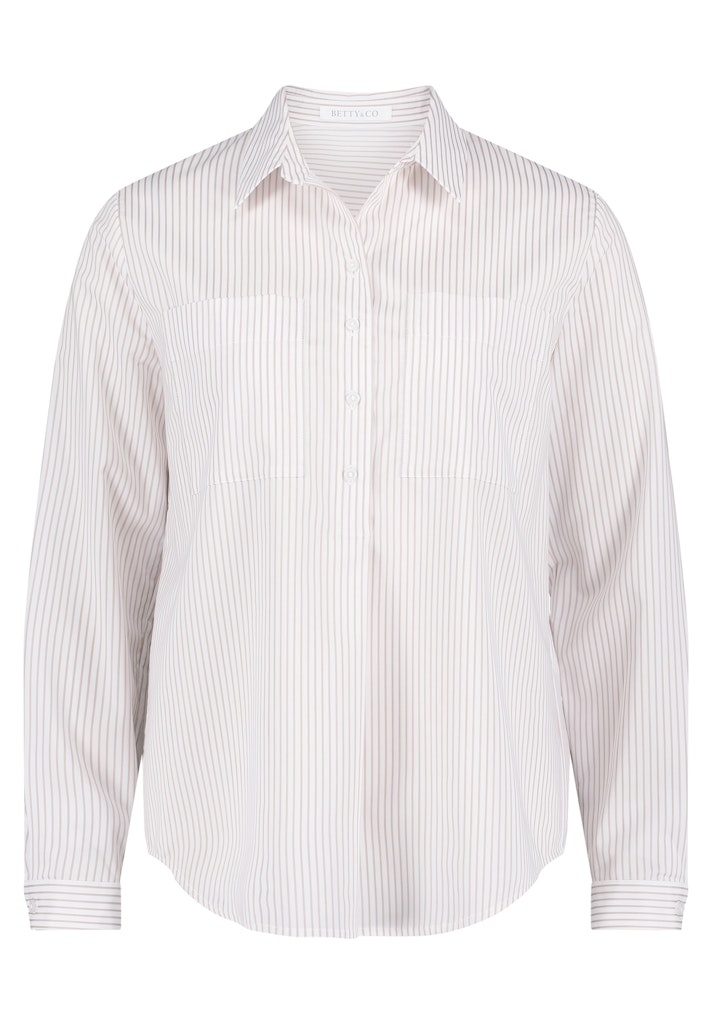 Betty & Co Blouse in het Zand/Offwhite met kraag, lange mouwen, 2 opgestikte zakken, rond gesneden en geheel gestreept.