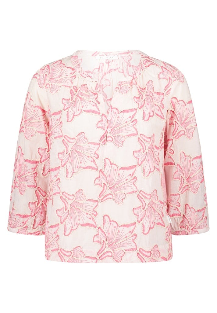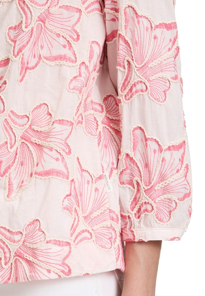 Betty & Co Blouse in de Kleur Zand/Rose Combinatie met ronde hals, V inzet, 3/4 mouwen met Rose print met borduurranden.