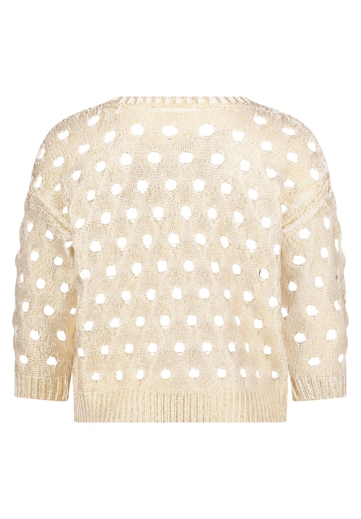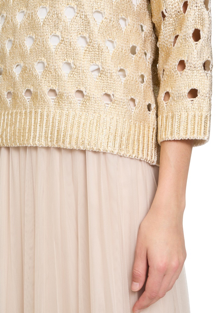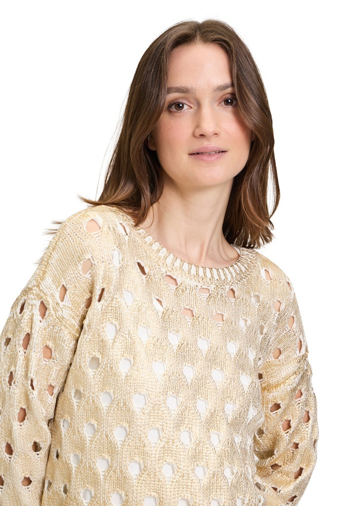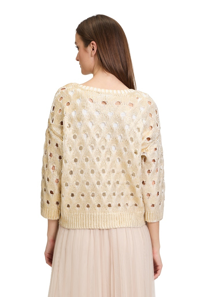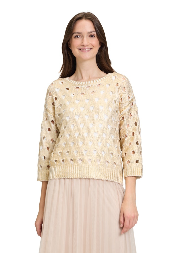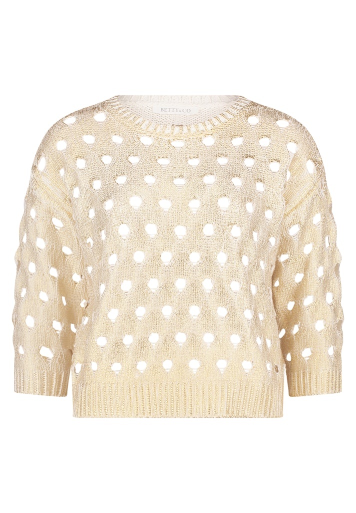 Betty & Co Pullover in het Goud/Beige Combinatie met ronde hals, 3/4 mouwen, opengewerkt en geheel met een gouden opprint.