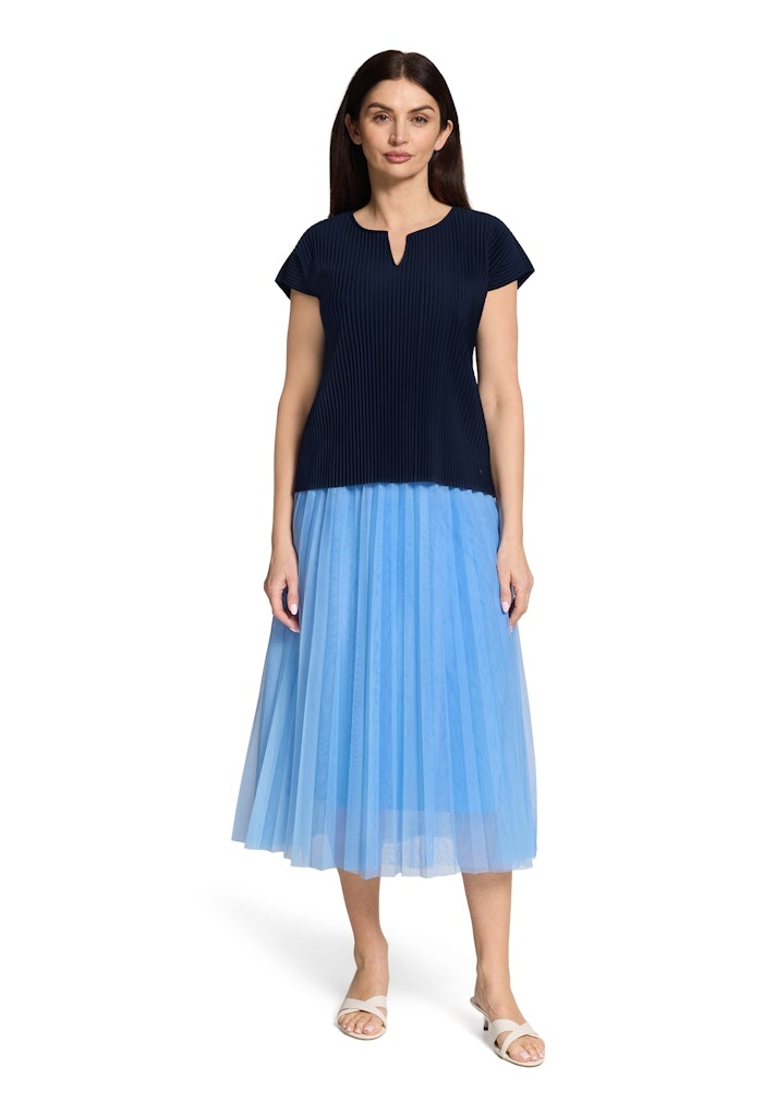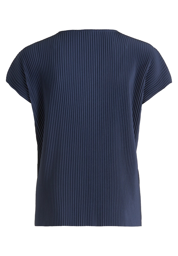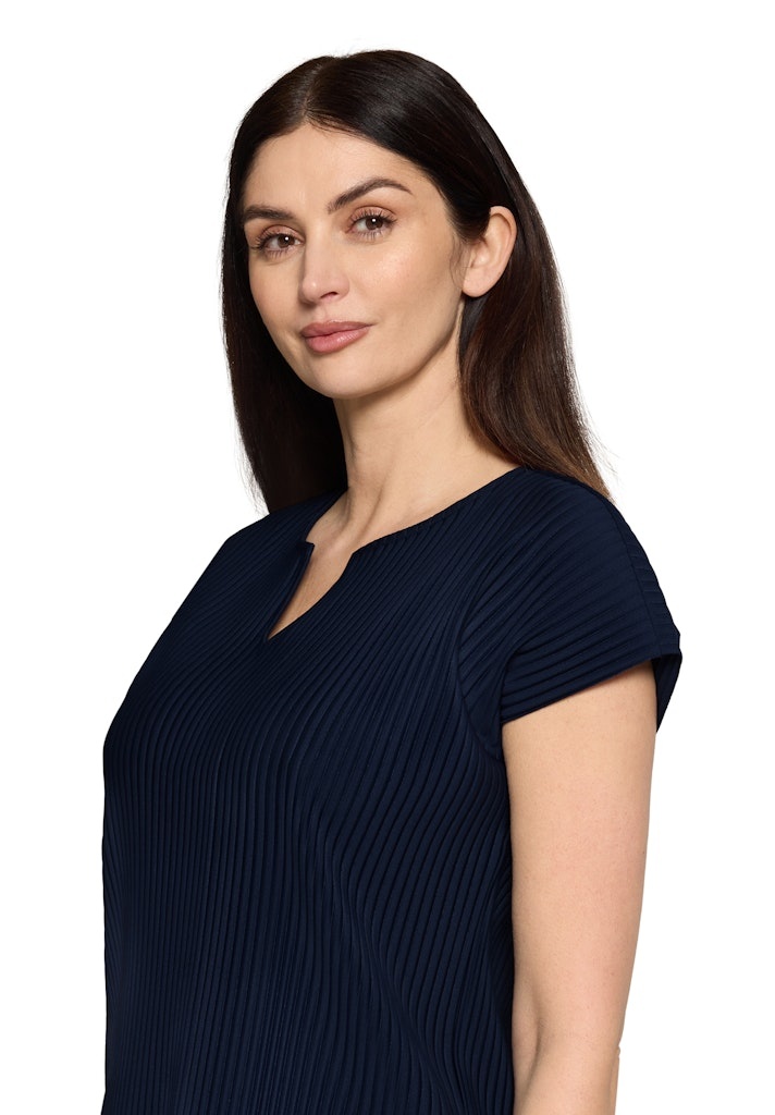 Betty & Co Shirt in de Kleur Marine met ronde hals en kleine V inzet, kapmouwen en geheel in een vaste plissee achtige look.