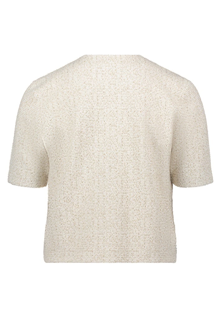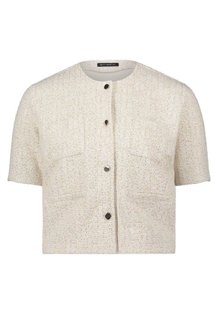 Betty Barclay Bolerojasje in de Kleur Zand Melange met ronde hals, knoopsluiting, korte mouwen en paspel en opgestikte zakjes.