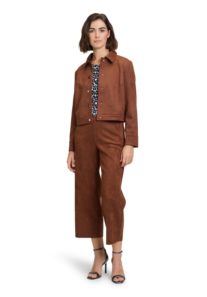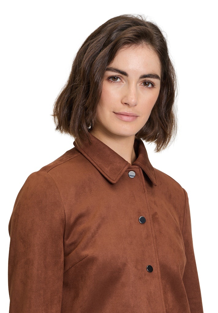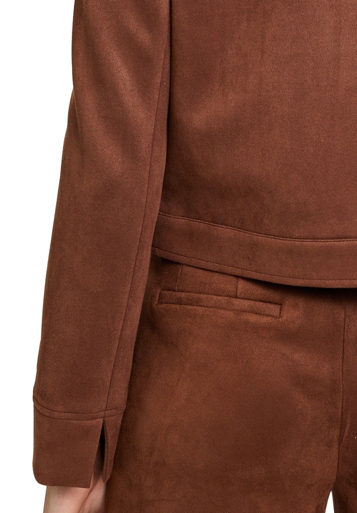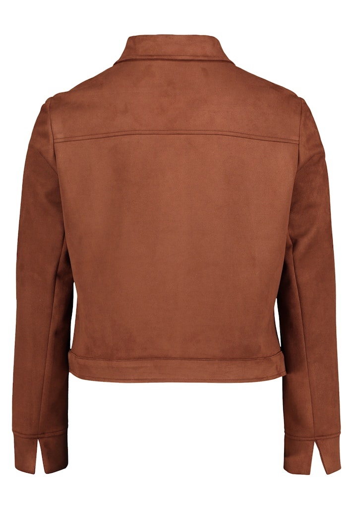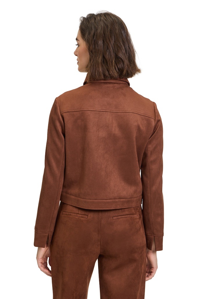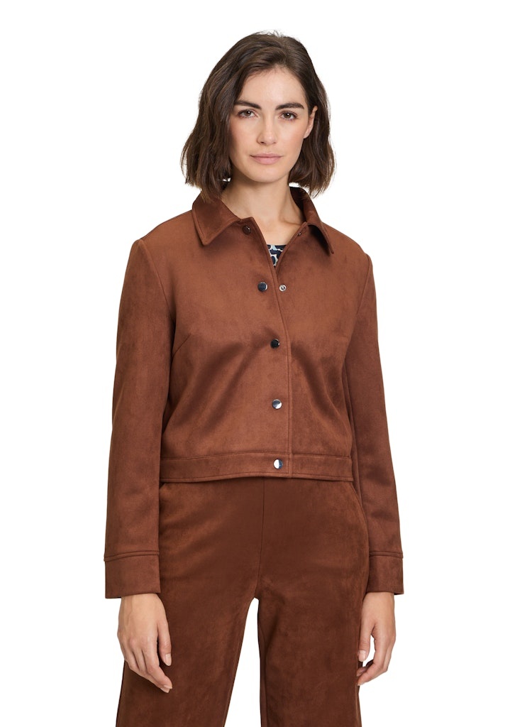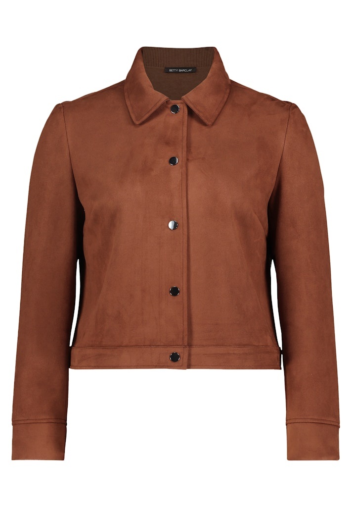 Betty Barclay Suedine achtig Jasje in de kleur Cognac met kraag, drukknoopsluiting en lange mouwen.