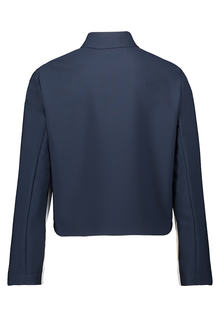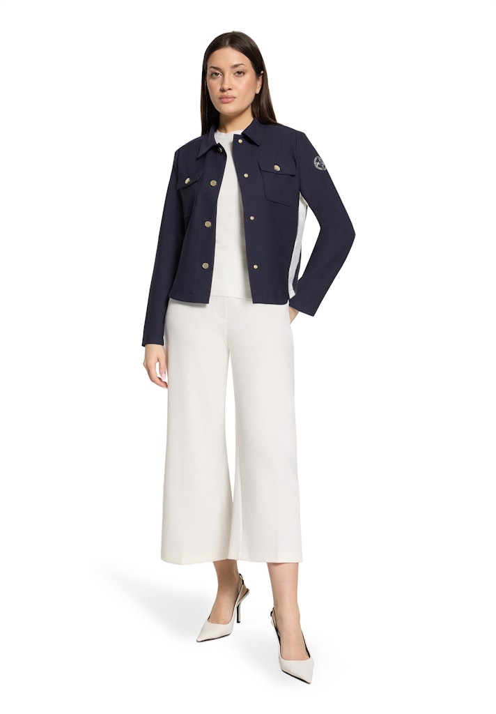 Betty Barclay Jasje in de Kleur Marine/Offwhite met kraag, knoopsluiting, klepzakken, lange mouwen met offwhite bies aan de zijkant.