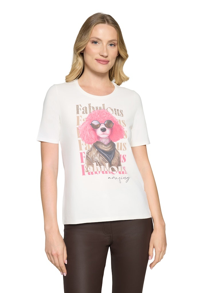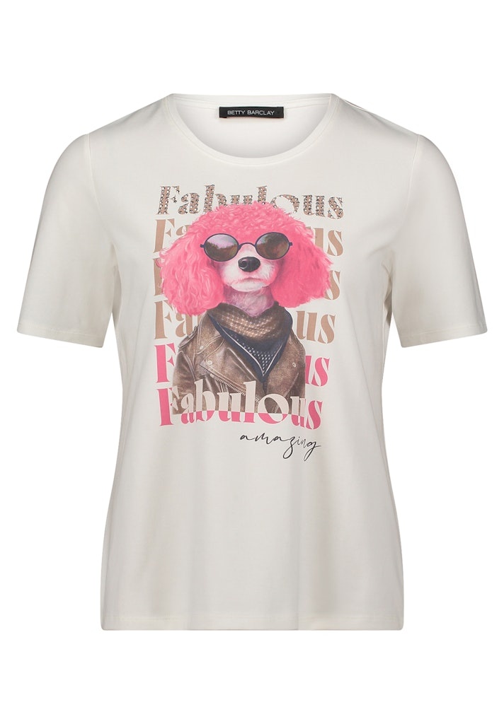 Betty Barclay Shirt in de Kleur Offwhite/Roze Combinatie met ronde hals, korte mouwen en een roze poedelprint.