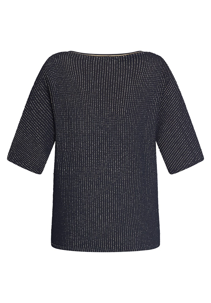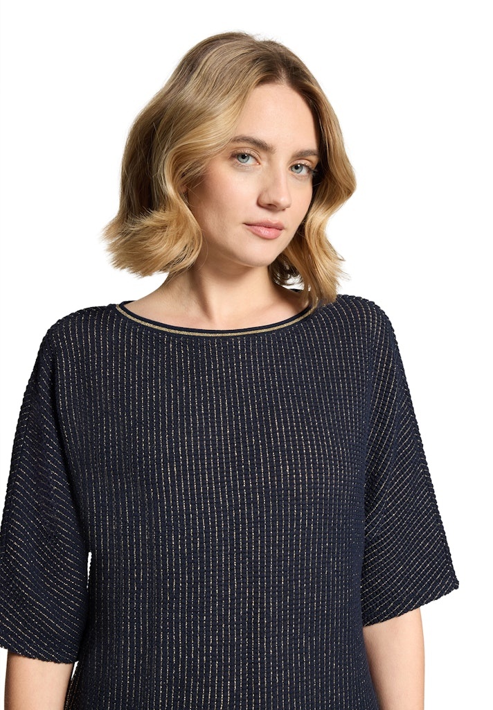 Betty Barclay Sweater in de Kleur Marine/Gouden Lurex met ronde hals, korte mouwen en een koord in de boord om het iets aan te trekken.