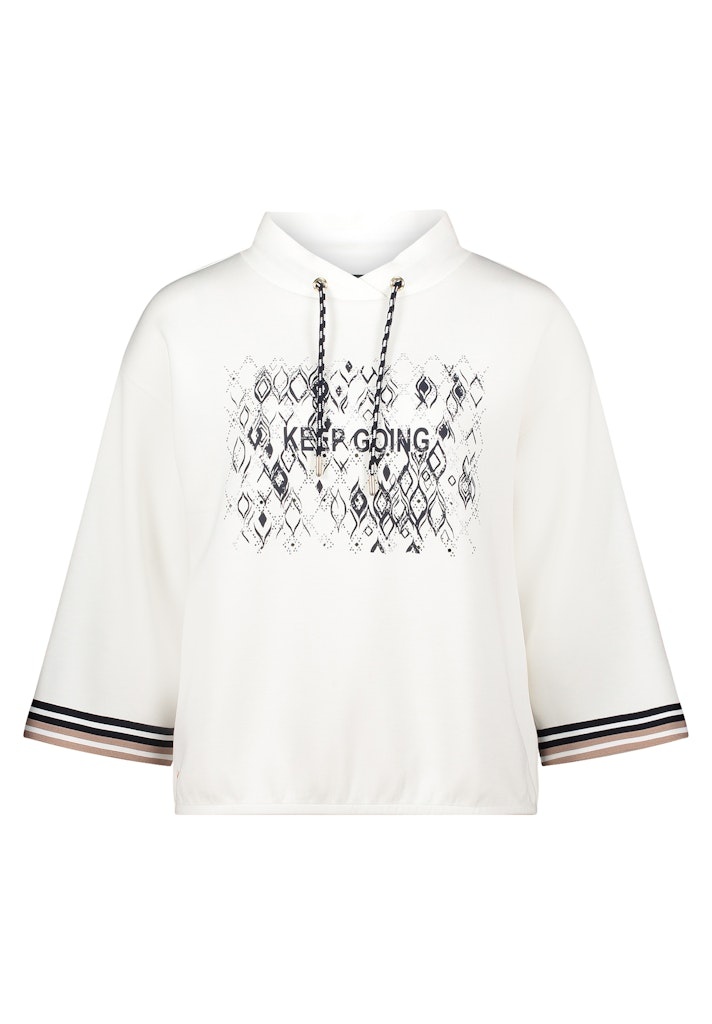 Betty Barclay Sweater in de Kleur Offwhite/Marine/Zand met staande hals met koort met 3/4 mouwen met streepbies en een print op de voorkant.