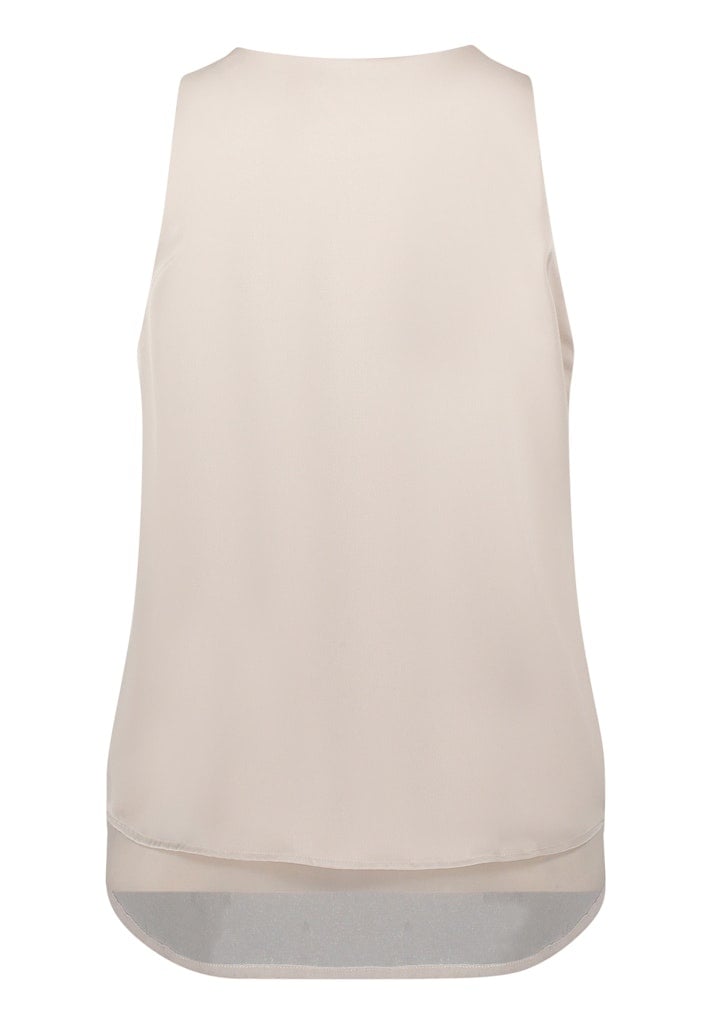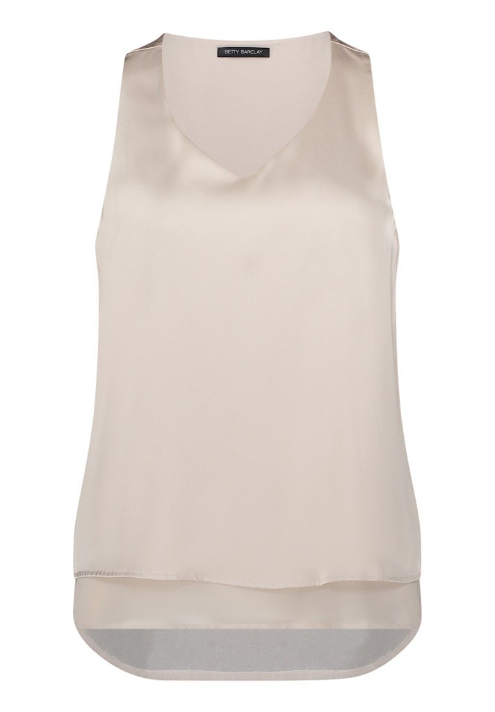 Betty Barclay Top in de Kleur Zand met V hals, dubbele voile voorkant en rond gesneden en achter iets langer.