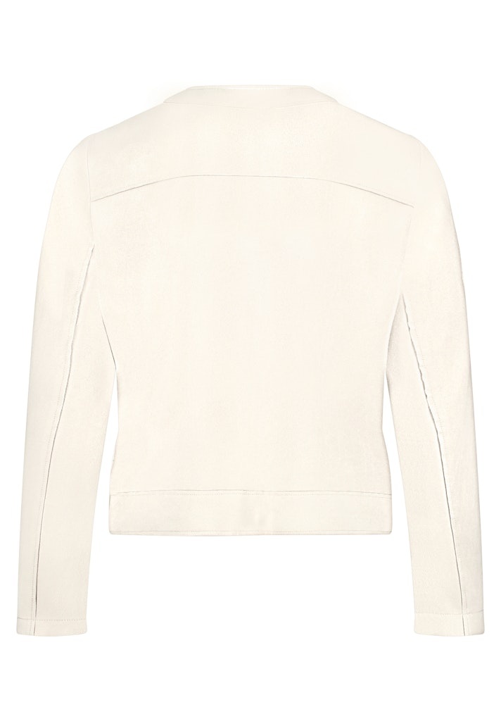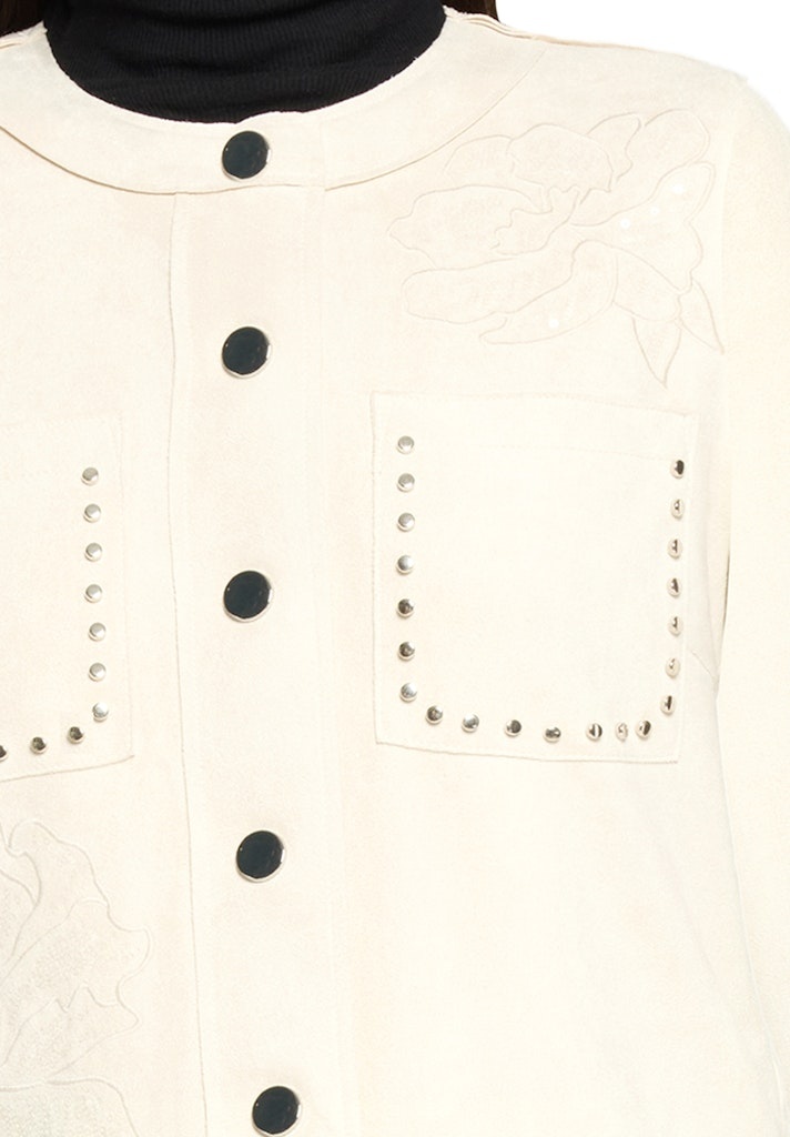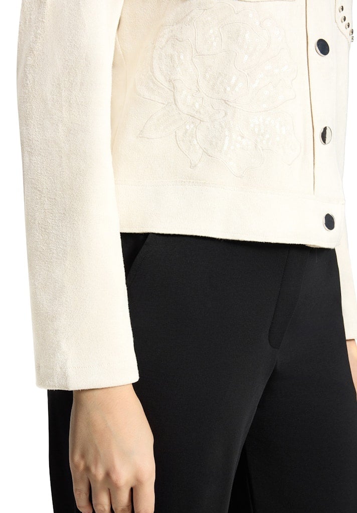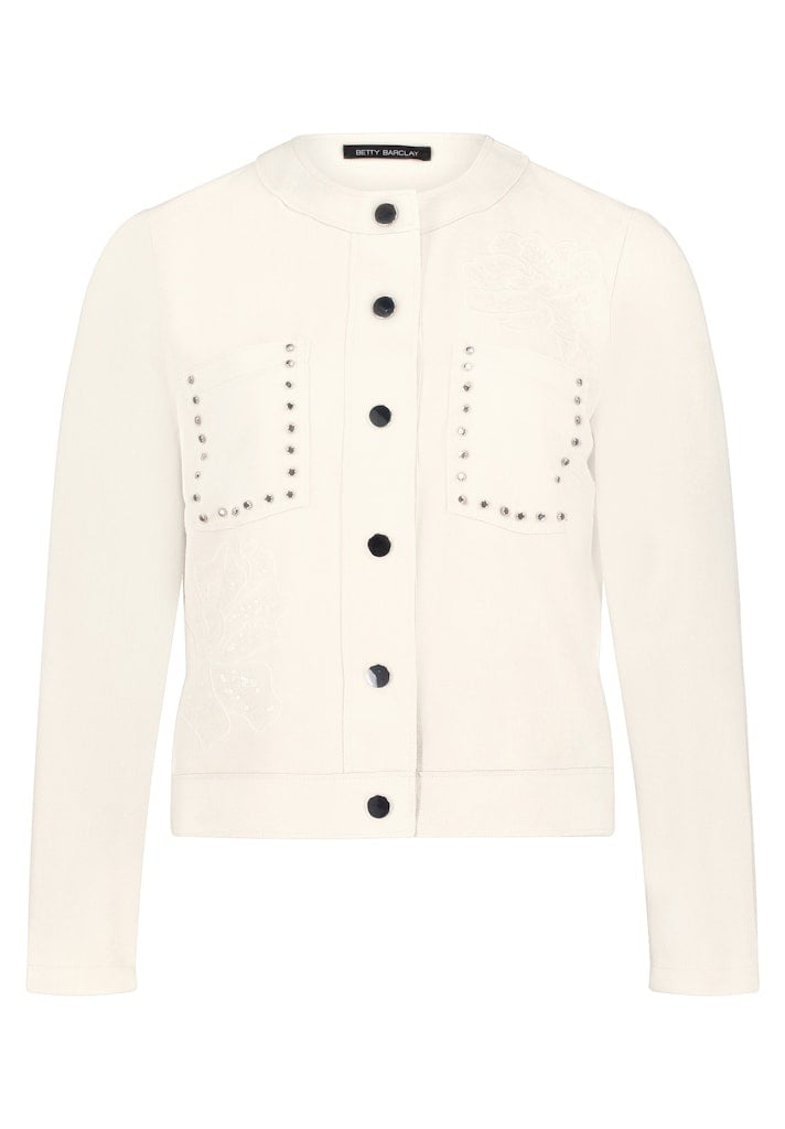 Betty Barlcay Suedine Jasje in de kleur Beige met ronde hals, drukknoopsluiting, opgestikte zakken met strassteentjes en lange mouwen.