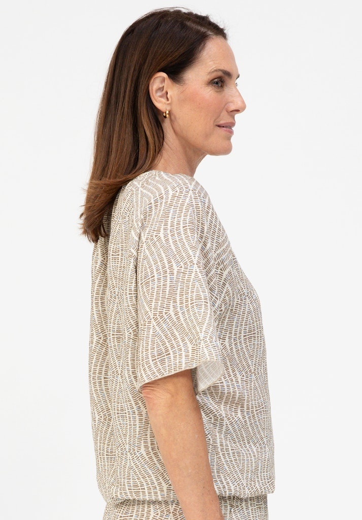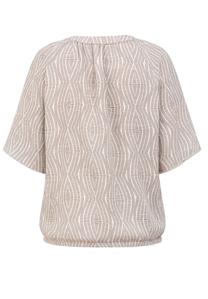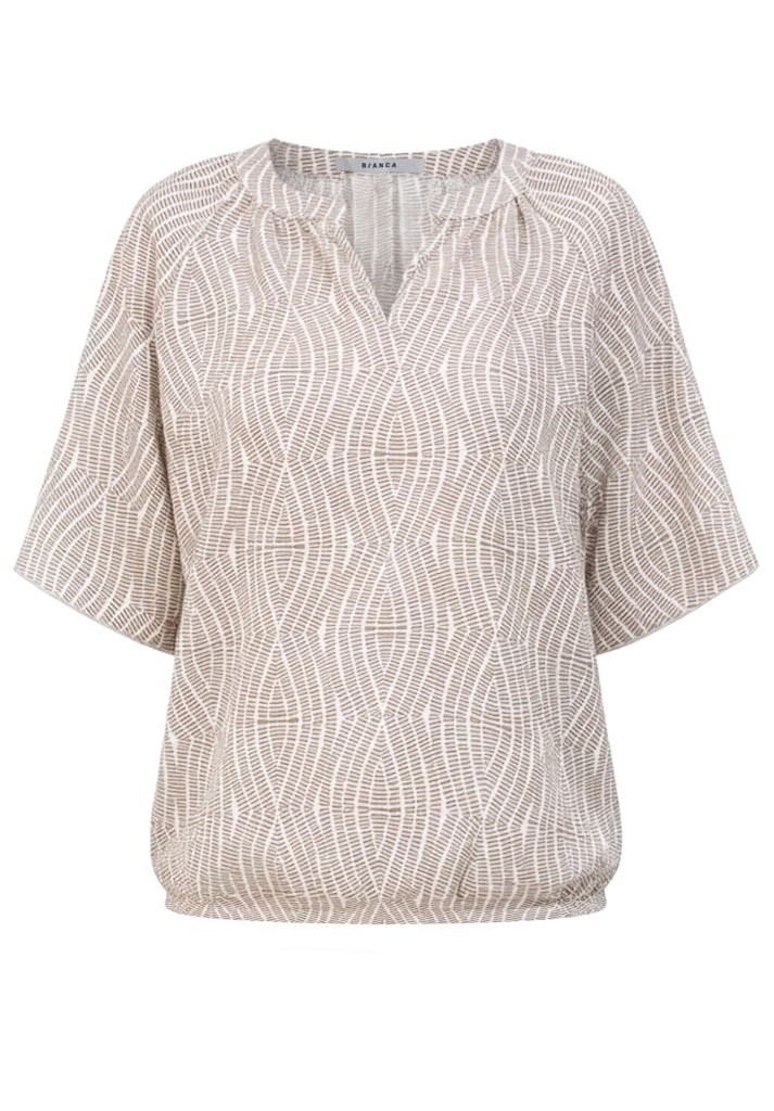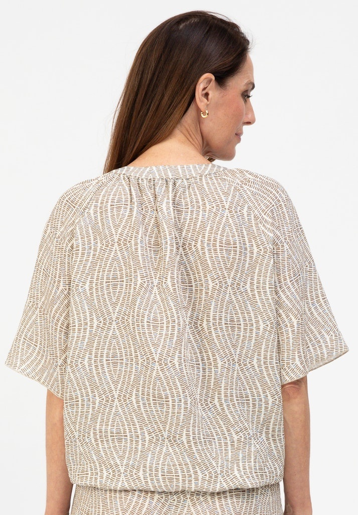 Bianca Blouson in de Kleur Beige/Offwhite met ronde hals en V inzet, korte mouwen en een elastisch koordje in de boord.
