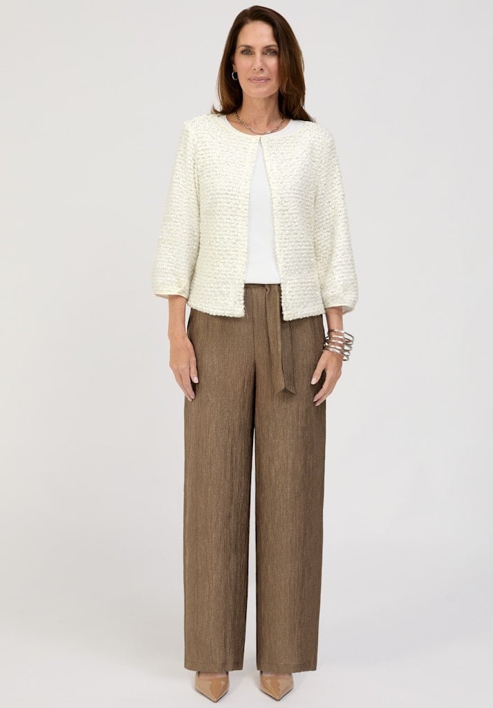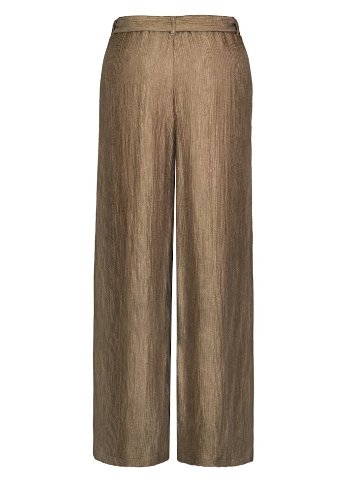 Bianca Broek in de Kleur Bruin met elastische band en strikceintuur, steekzakken en rechte wijde pijp en stof in een mooie gekrinkelde kwaliteit.