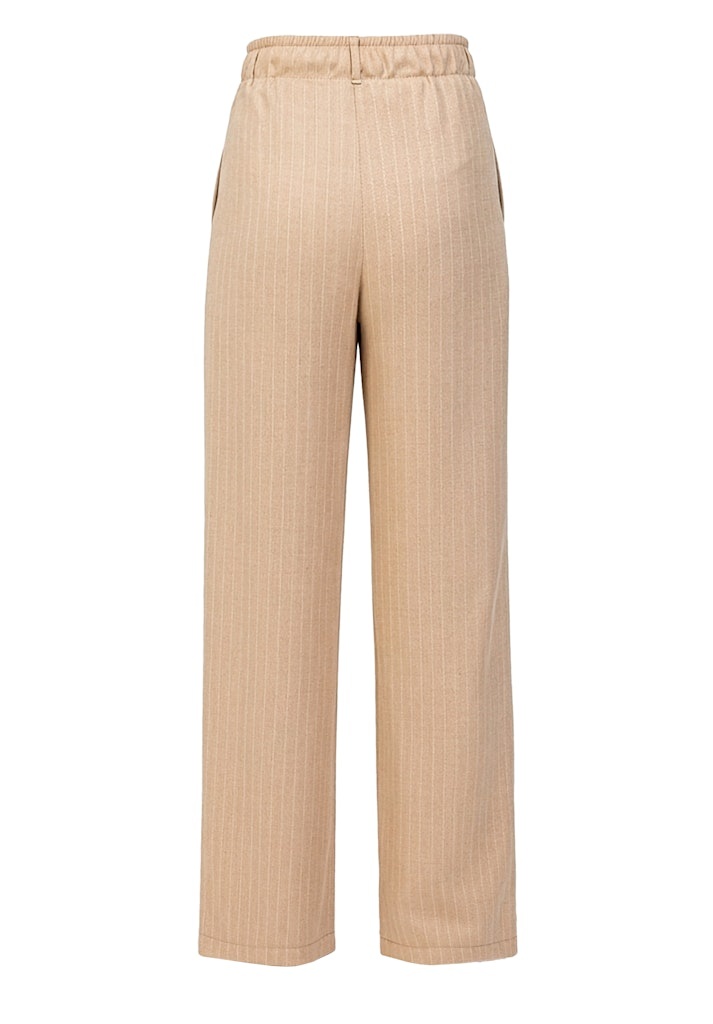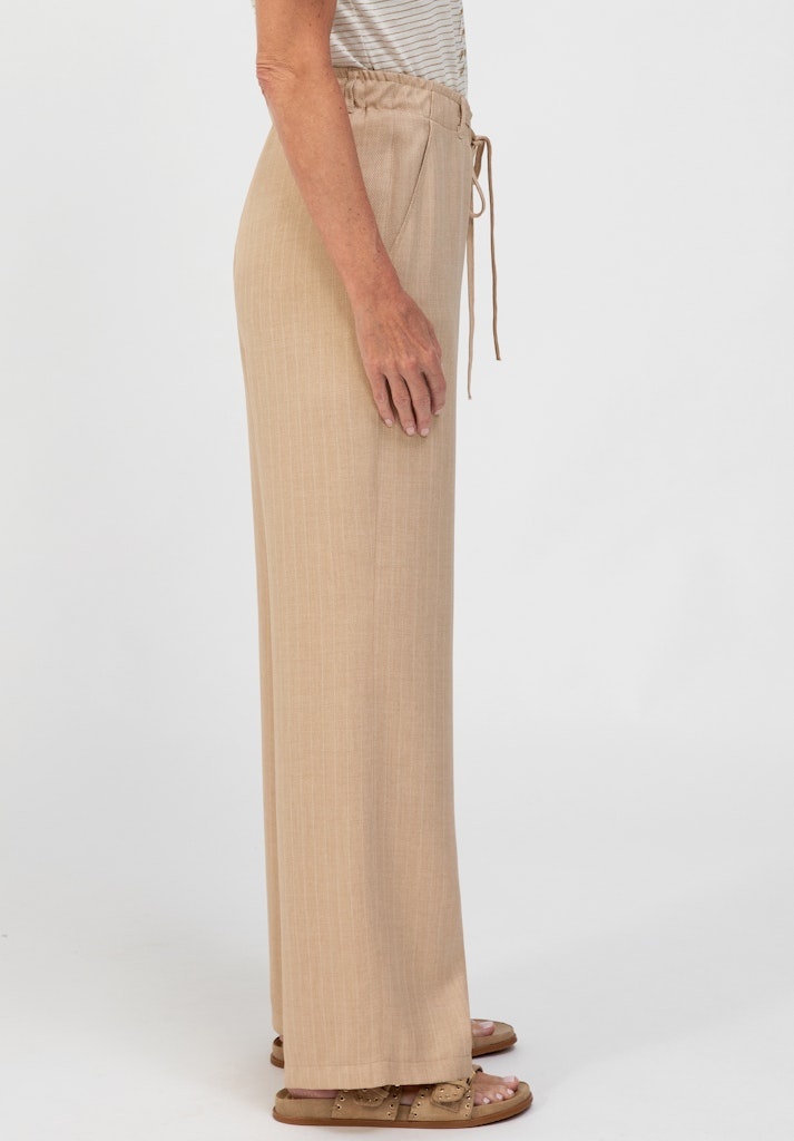 Bianca Broek in de Kleur Camel met elastische band met strikkoord, steekzakken, Wide Leg en geheel in een verfijnde streep.