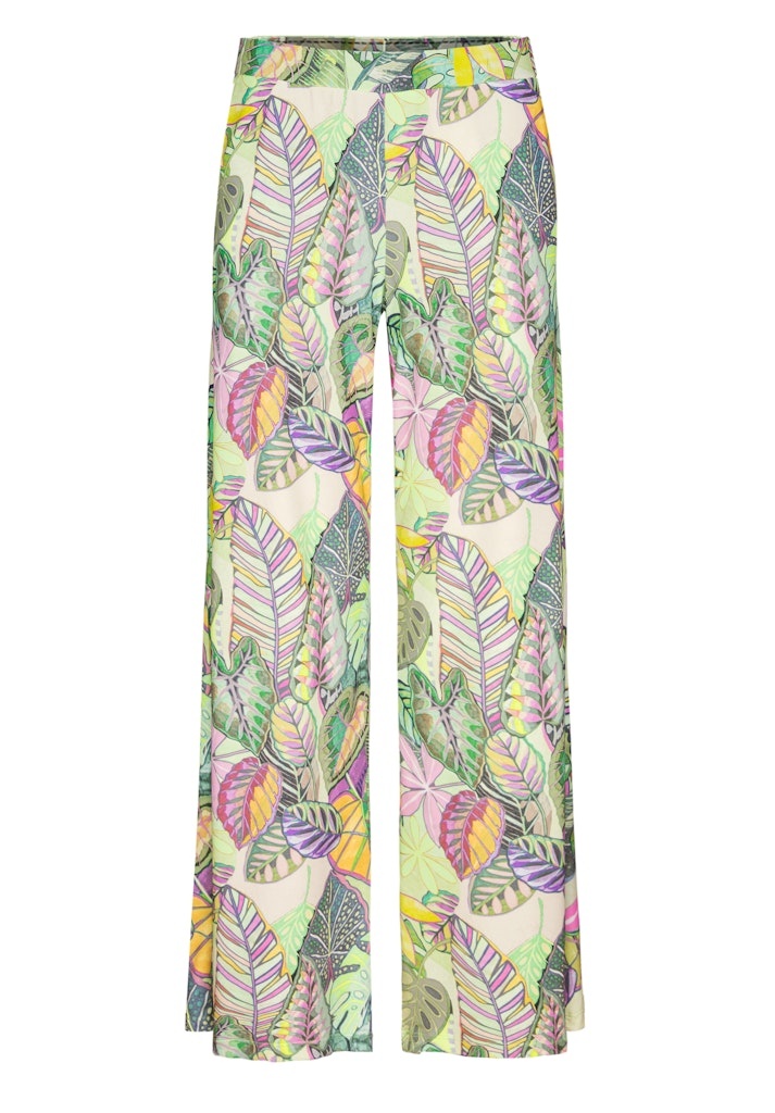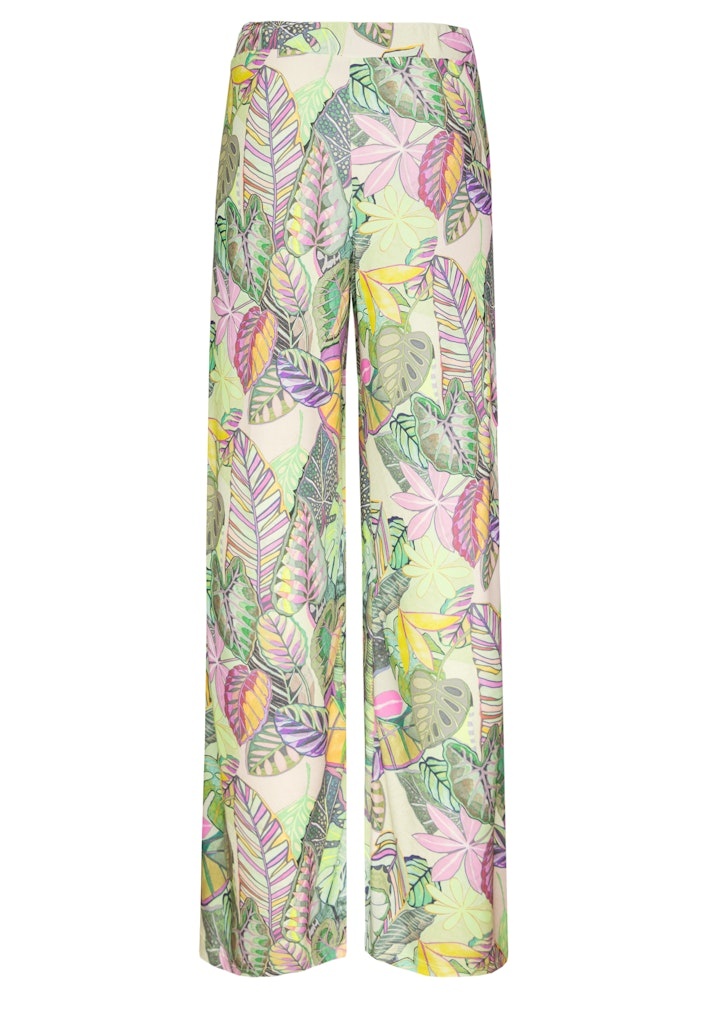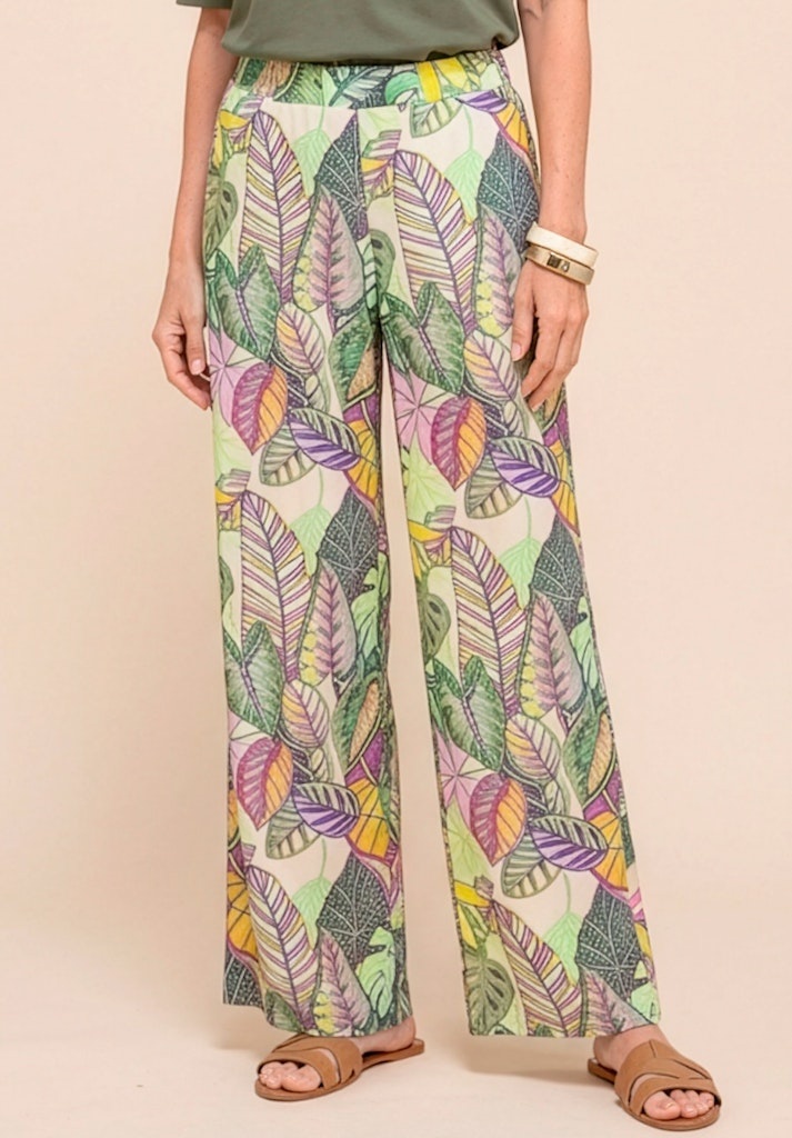 Bianca Broek in de Kleur Groen met elastische band, losvallend om de benen met wijde pijp en geheel in een bladprint.