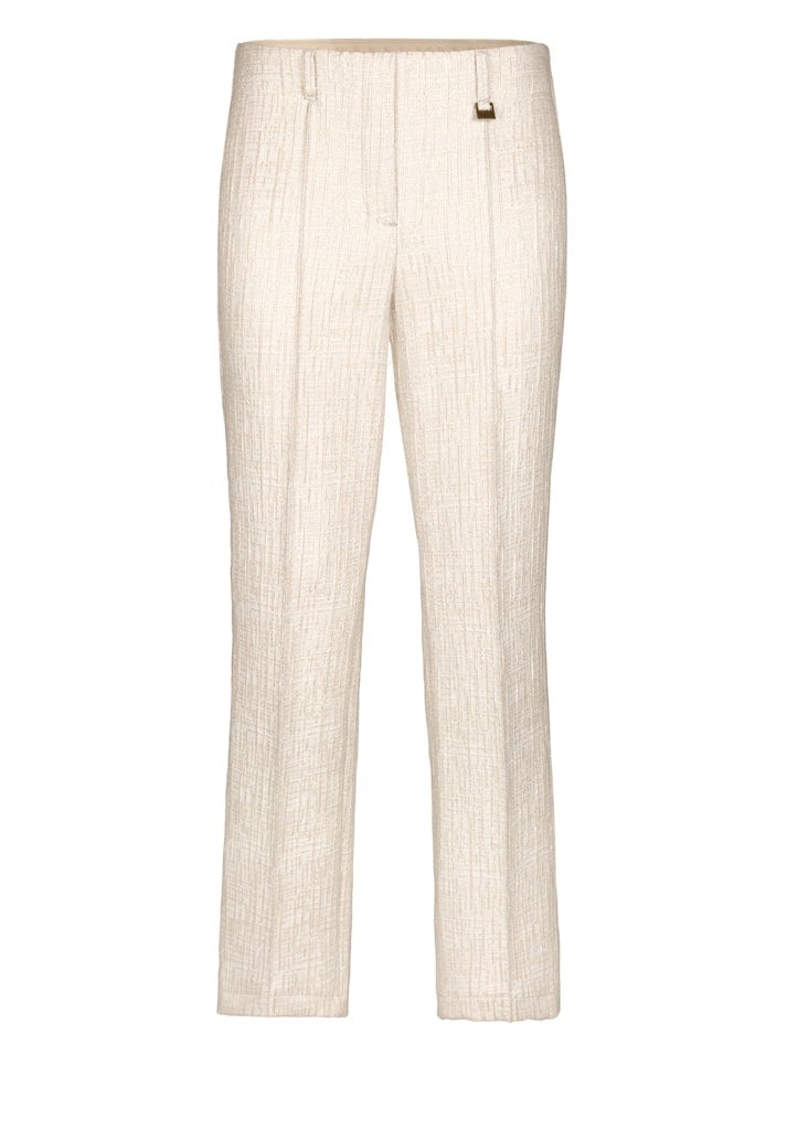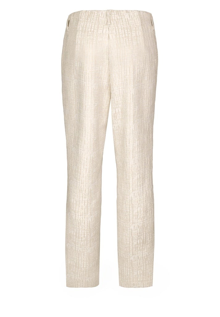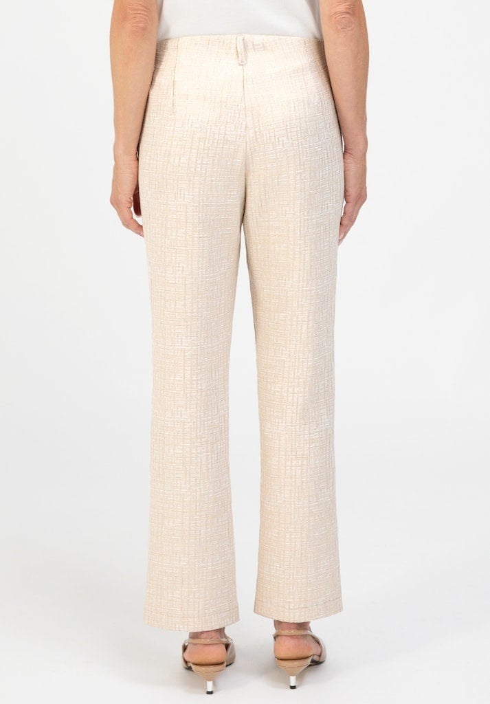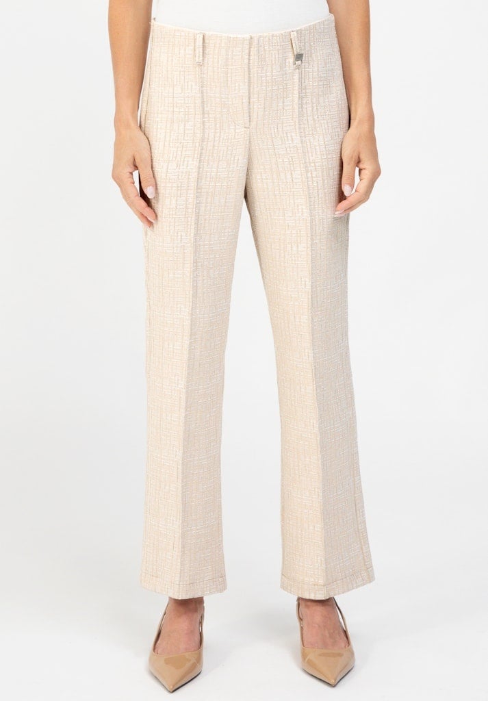Bianca Broek in de Kleur Zand Combinatie in een knoopsluiting, steekzakken en vanaf de knie iets uitlopend en enkelvrij. Er zit een voelbare print in de stof.