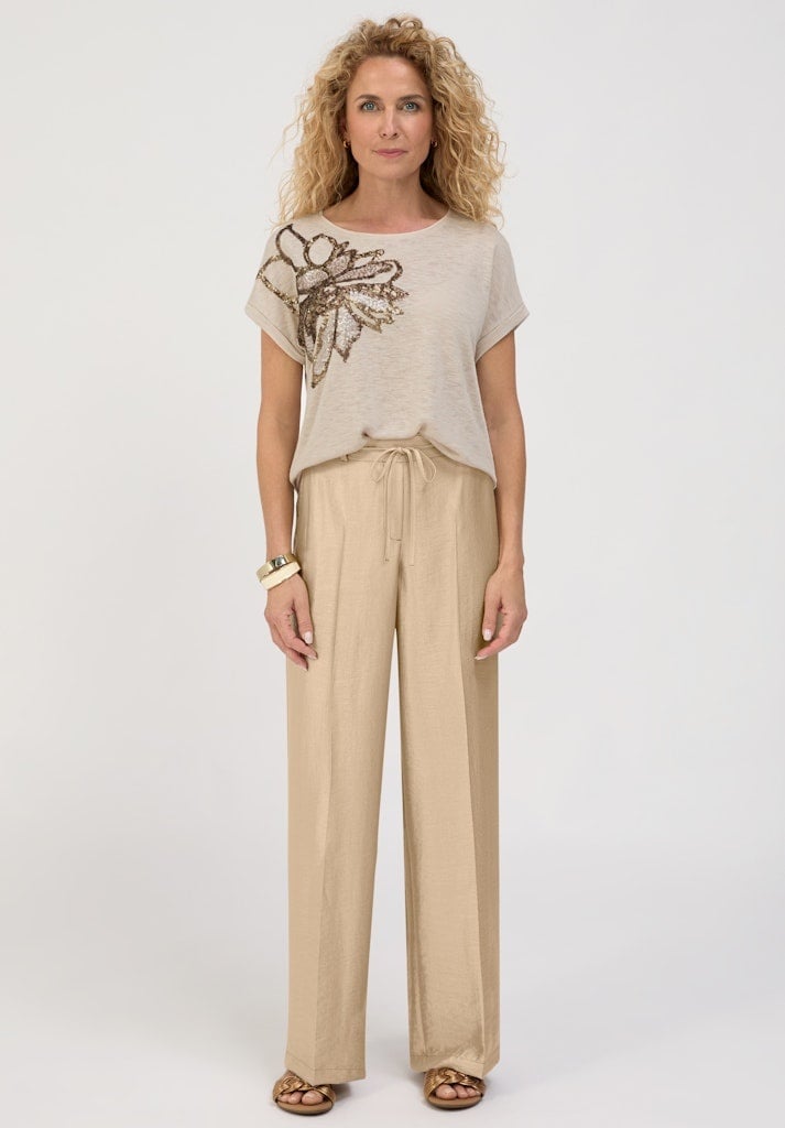 Bianca Pullover in de Kleur Beige met ronde hals, kapmouwen, elastisch boord, grote bloem in pailletten en geheel in een mooie en vooral soepele dunne kwaliteit.