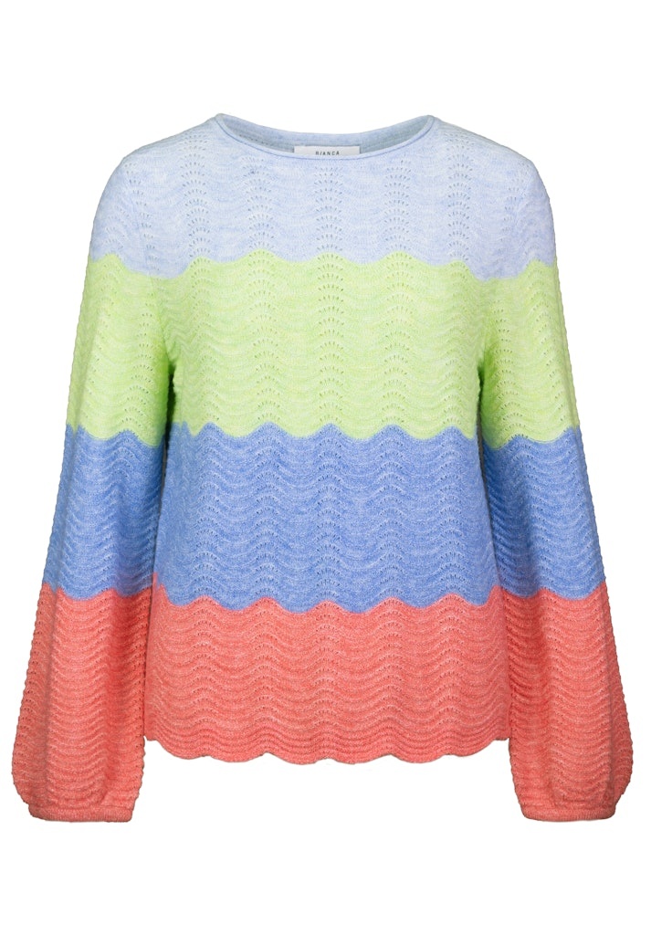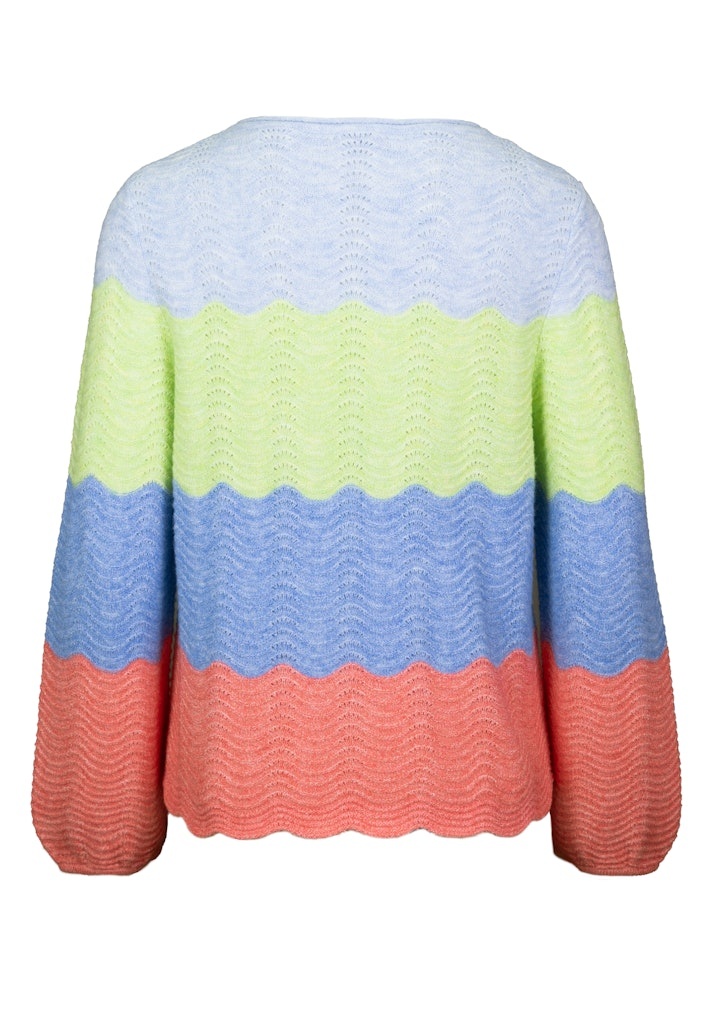 Bianca Pullover in de Kleur Koraal/Blauw Combinatie met ronde hals, lange mouwen met iets wijdere mouwen, golvende onderrand en 4 kleurbalken.
