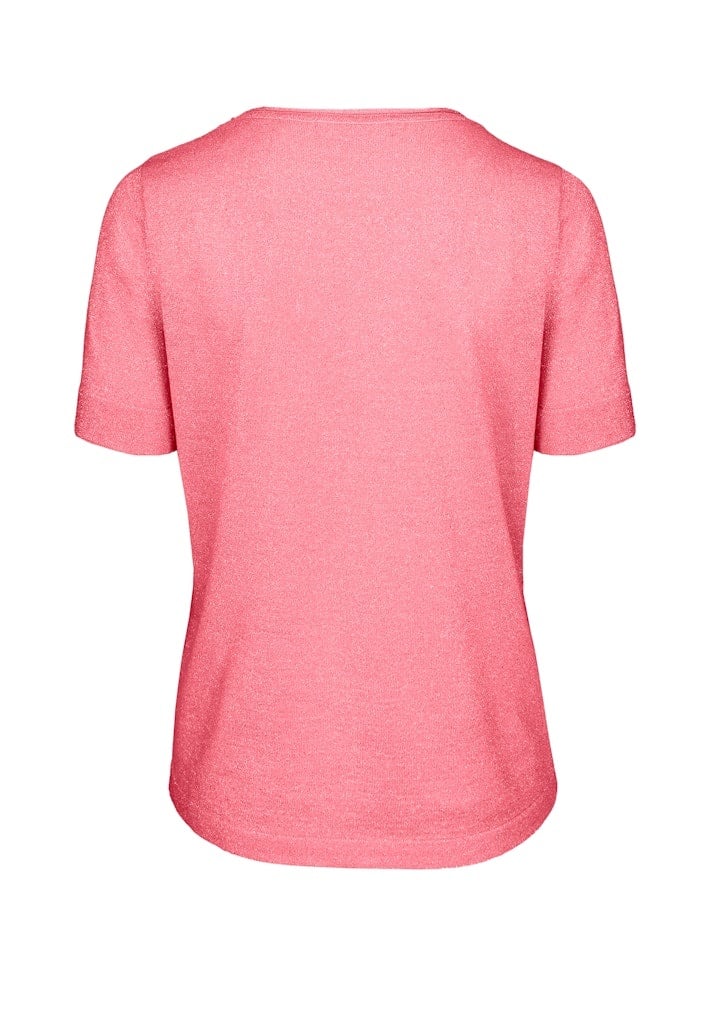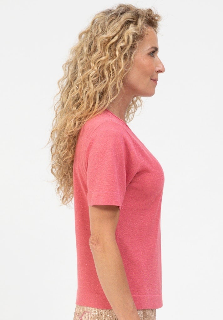Bianca Dunne Pullover in de Kleur Pink met ronde hals met klein rolletje als bies, korte mouwen en een kleine sparkle in de garens.