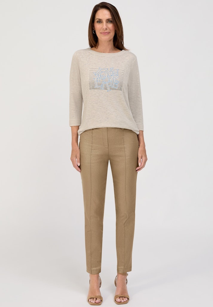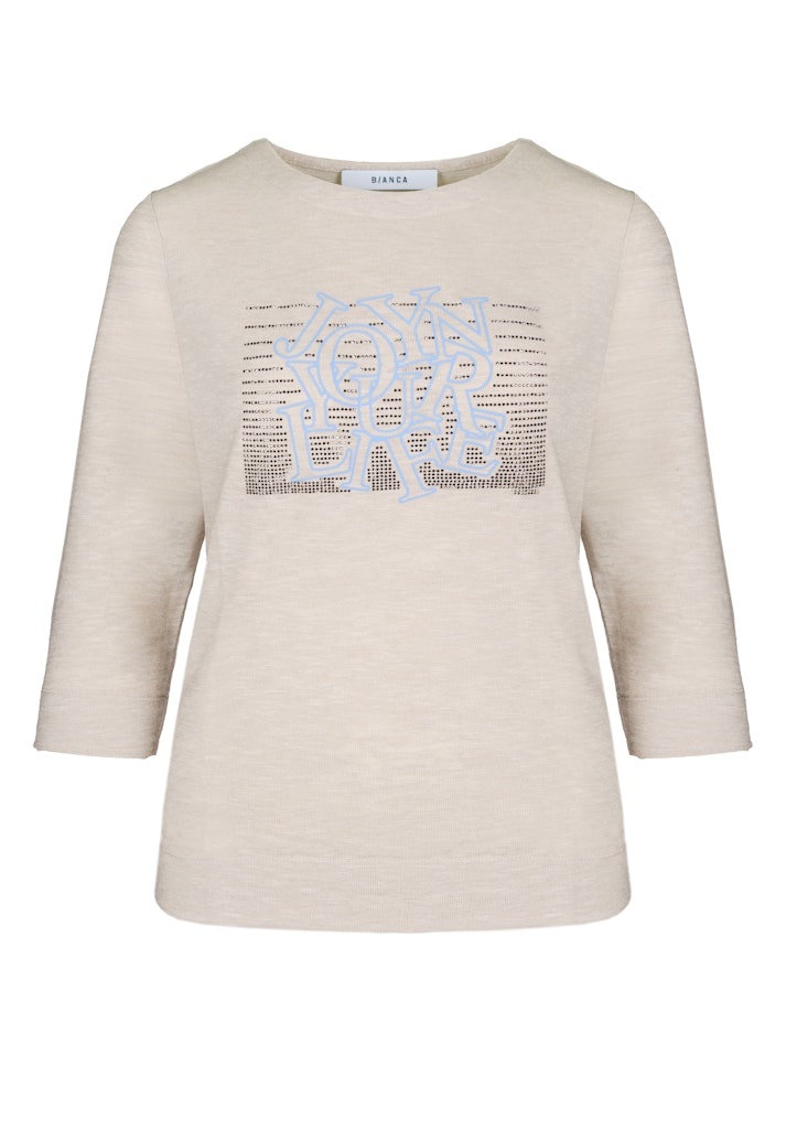 Bianca Pullover in de Kleur Zand/Blue met ronde hals, 3/4 mouwen en een kleine print op de voorkant met strasssteentjes en letters.