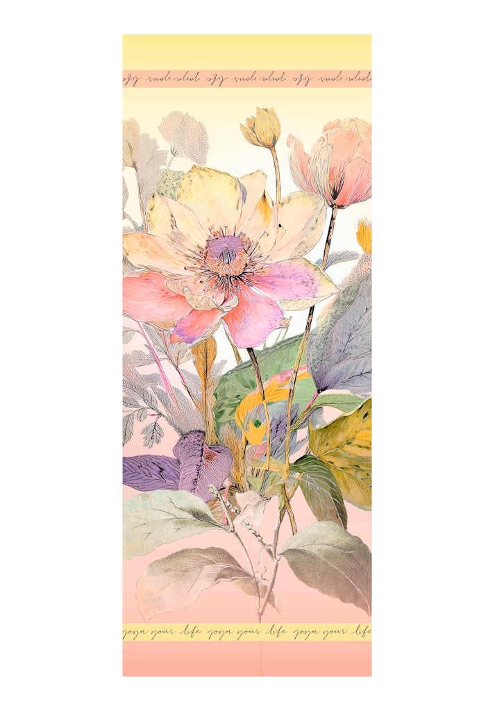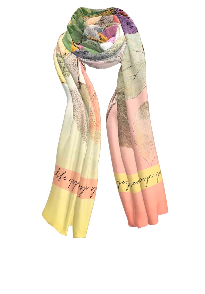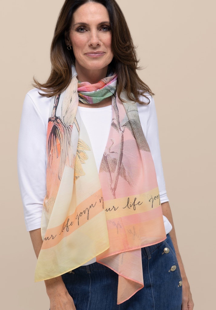 Bianca Langwerpige Shawl in de Kleur Geel Combinatie met een bloemboeketprint.