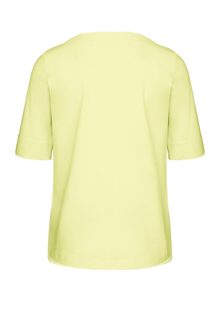 Bianca Shirt in de Kleur Geel met ronde hals, korte mouwen en een postzegelprint op de voorkant.