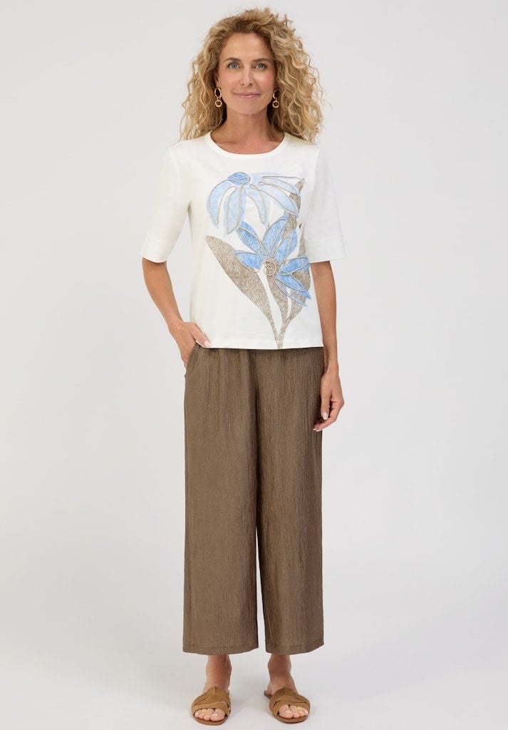 Bianca Shirt in de Kleur Offwhite/Blauw/Bruin Combinatie met ronde halsm korte mouwen en een print met pailletten op de voorkant.