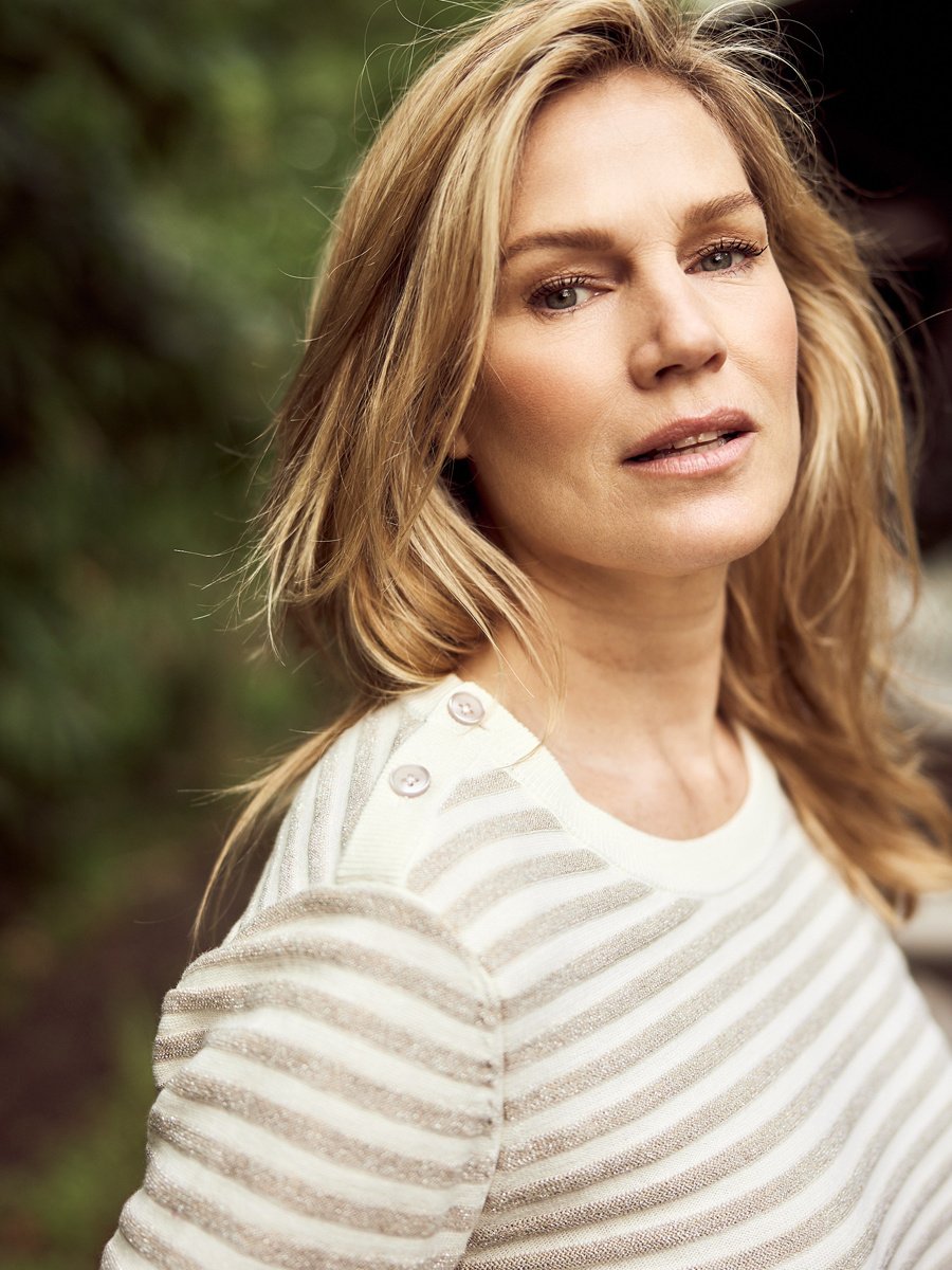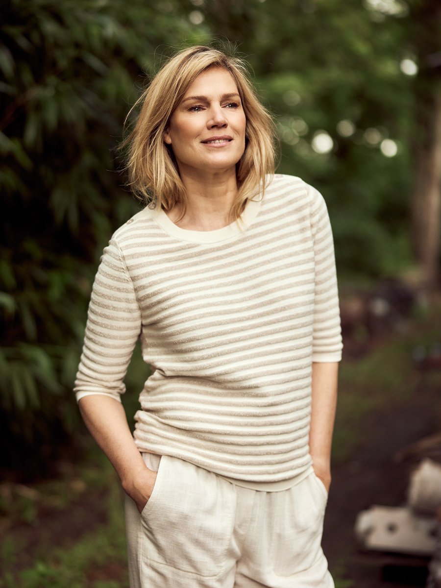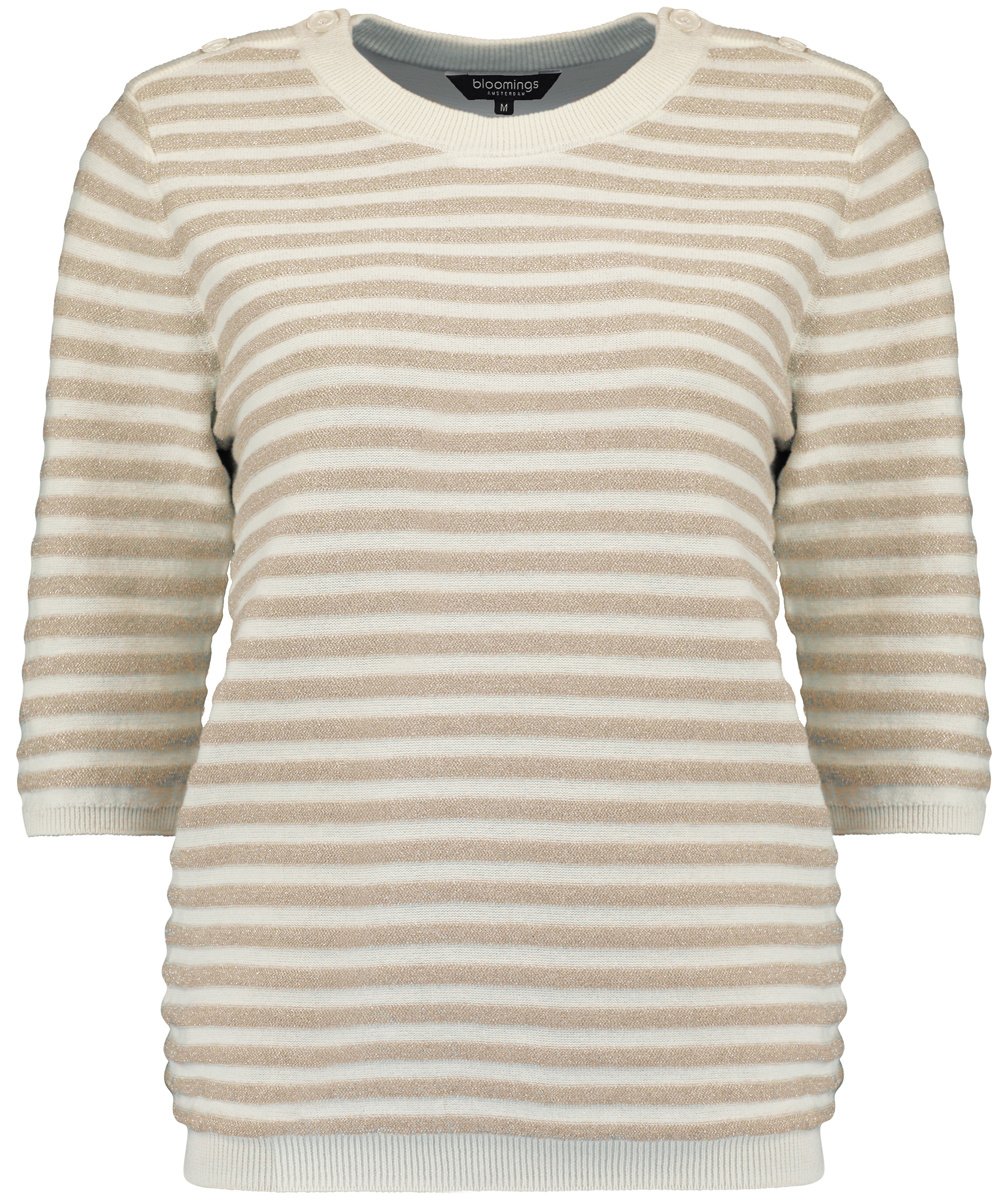 Bloomings Pullover in de Kleur Zand Gestreept met ronde hals, 3/4 mouwen en een elastisch boord.