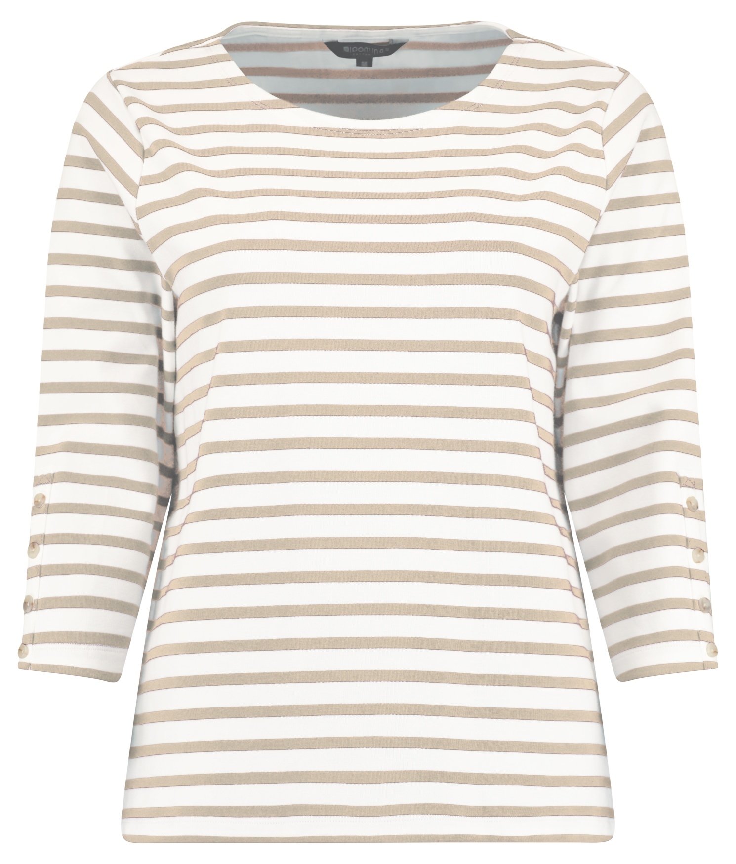 Bloomings Shirt in de Kleur Zand/Wit gestreept met ronde hals, 3/4 mouwen met knoopjes onderaan de arm.