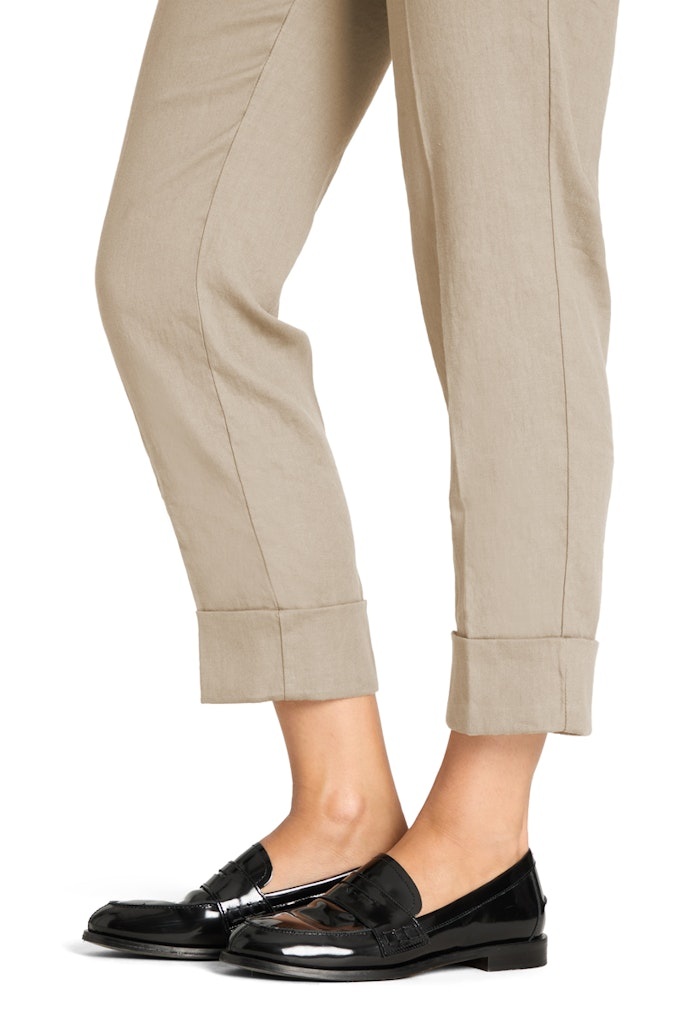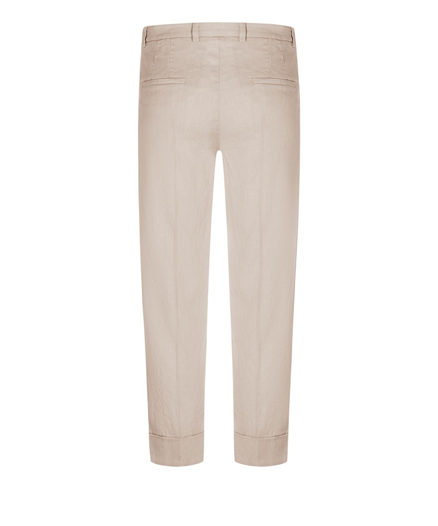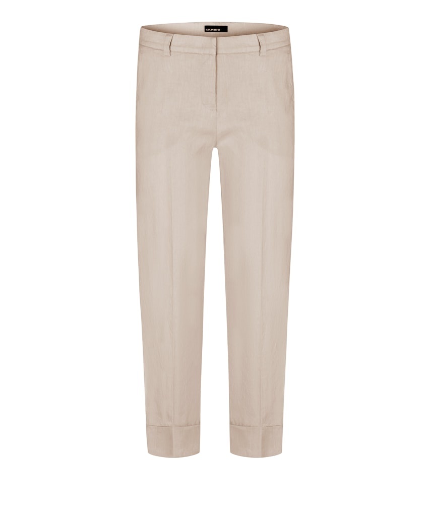 Cambio Enkelvrije Linnen/Katoen Broek in de Kleur Zand met knoopsluiting, steekzakken en "manchetten" aan de pijp.