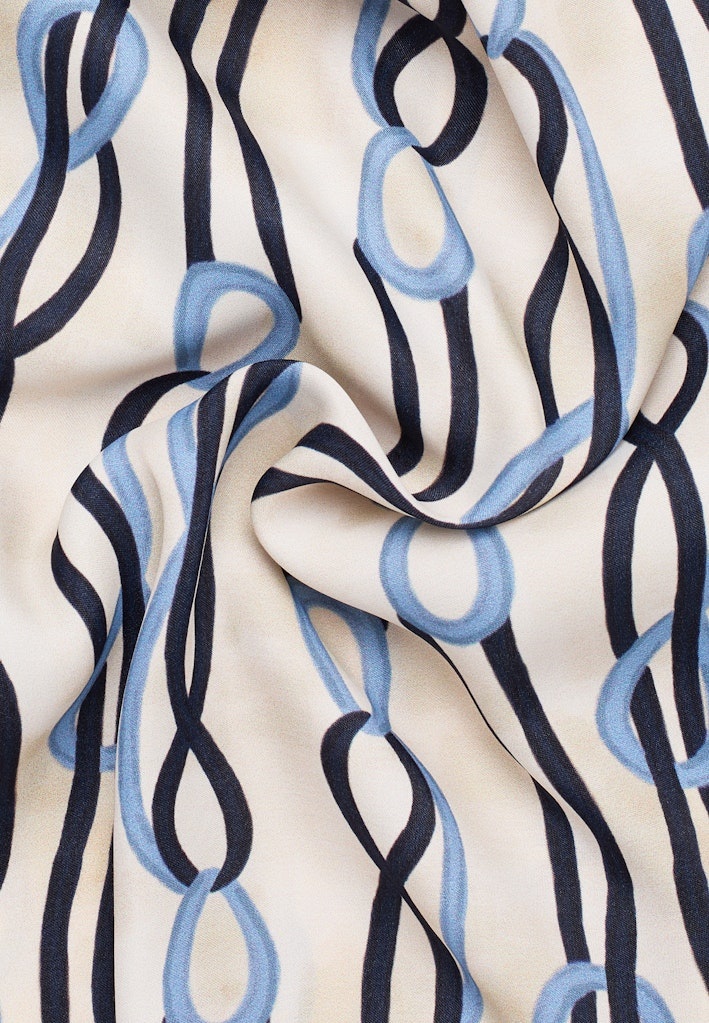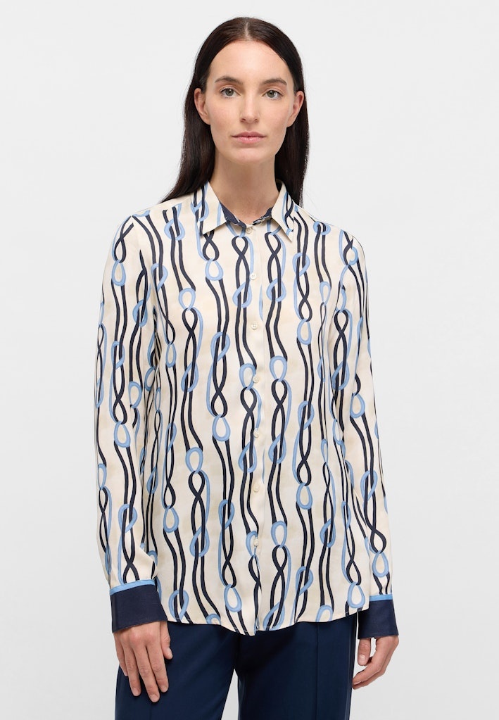 Eterna Blouse in de Kleur Marine met Beige ondergrond met kraag, doorknoopsluiting, lange mouwen, rond gesneden en in een kabelprint.
