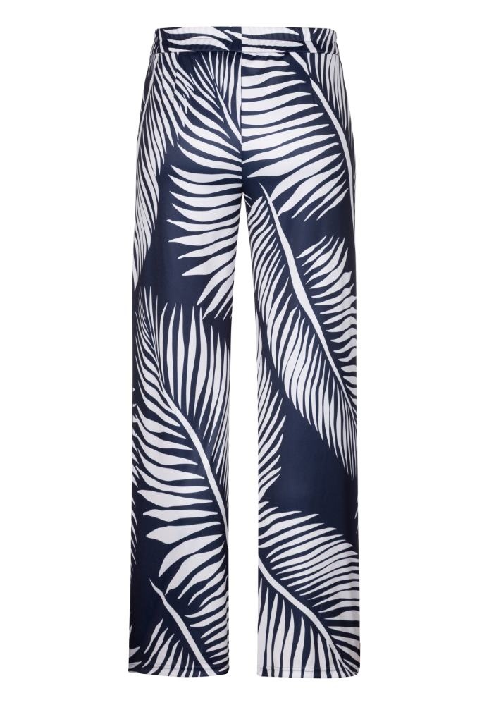 Frank Walder Broek in de Kleur Marine/Zand Combinatie met elastische band, recht lopende pijpen en geheel in een bladprint.