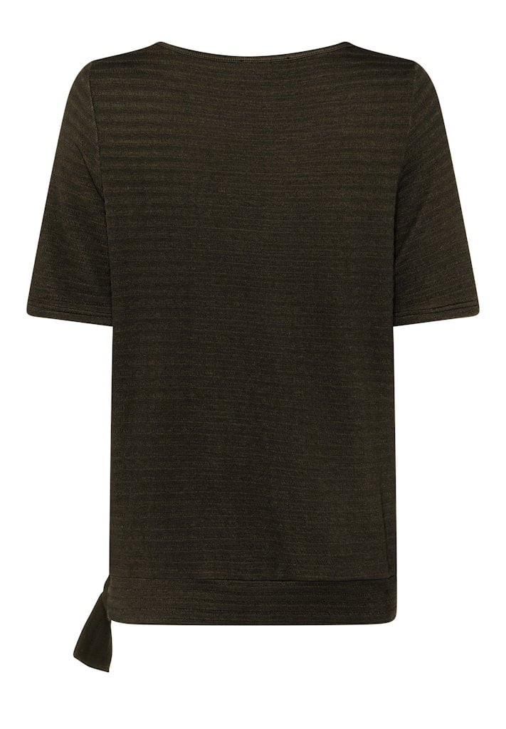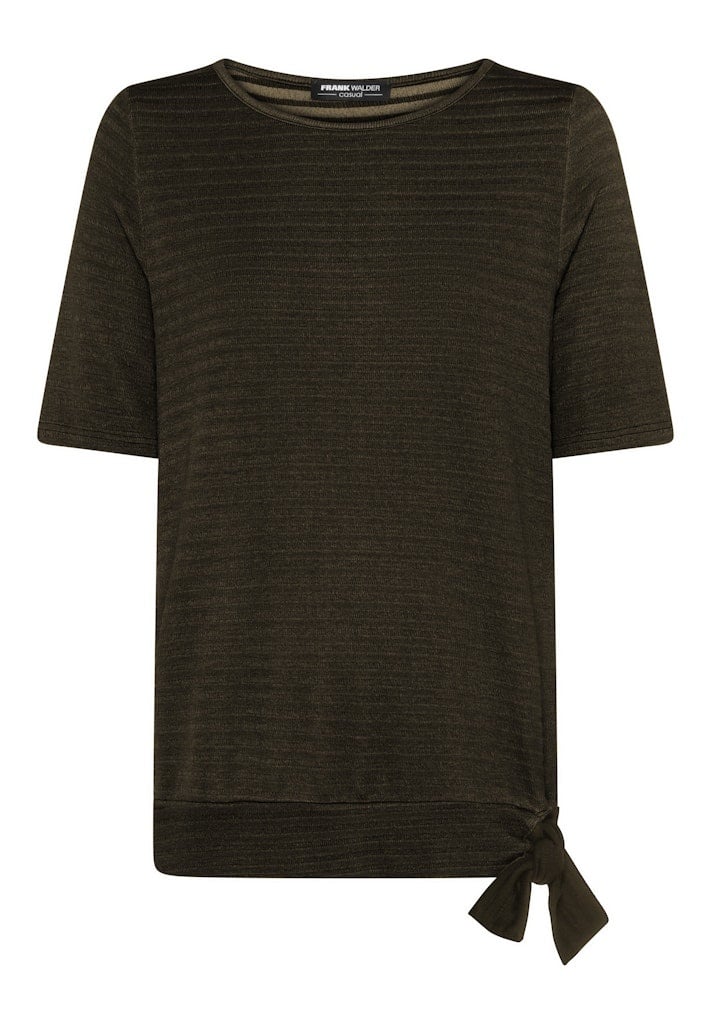 Frank Walder Shirt in de Kleur Olijf met ronde hals, korte mouwen, strikknoop in de boord om het iets aan te snoeren en in een reliefribbel.