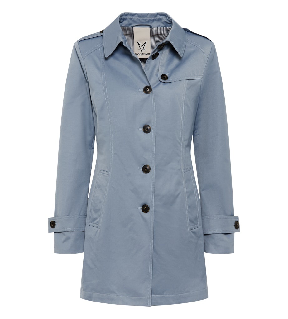 Fuchs Schmitt Parka in de Kleur Blue met kraag, knoopsluiting, steekzakken en ceintuur. De jaslengte is 84 cm.