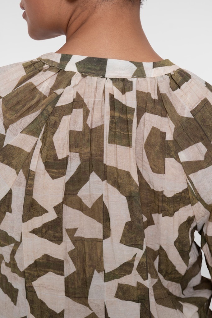 Geisha Blouse in de Kleur Hazelnoot met staande hals en V inzet met knoopsluiting en 3/4 mouwen.