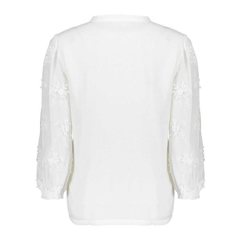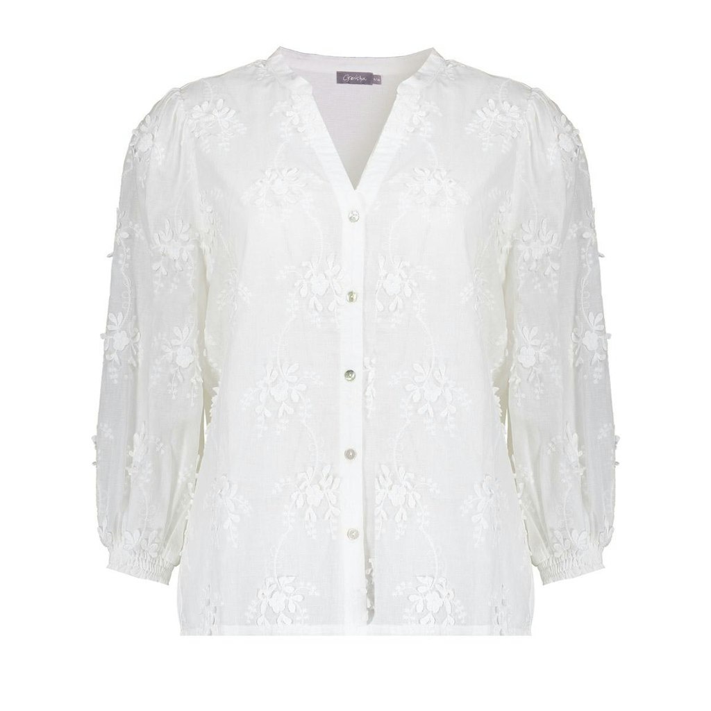 Geisha Blouse in de Kleur Offwhite met staande hals, V inzet, knoopsluiting, 3/4 mouwen en geheel met kantbloemen voorzien.