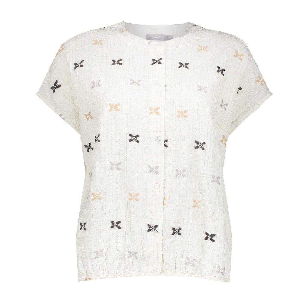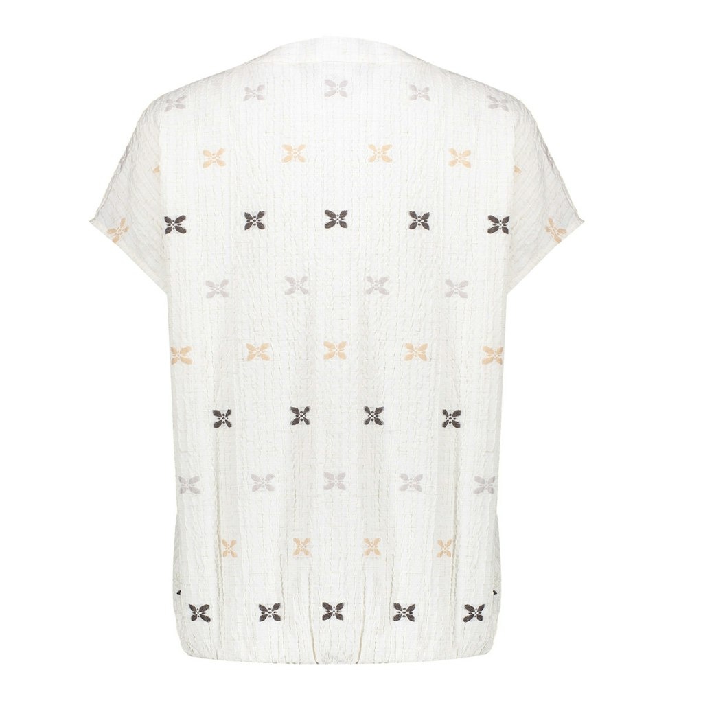 Geisha Blouse in de Kleur Offwhite Combinatie met ronde hals, kapmouwen en geborduurde icoontjes over de stof verdeeld.