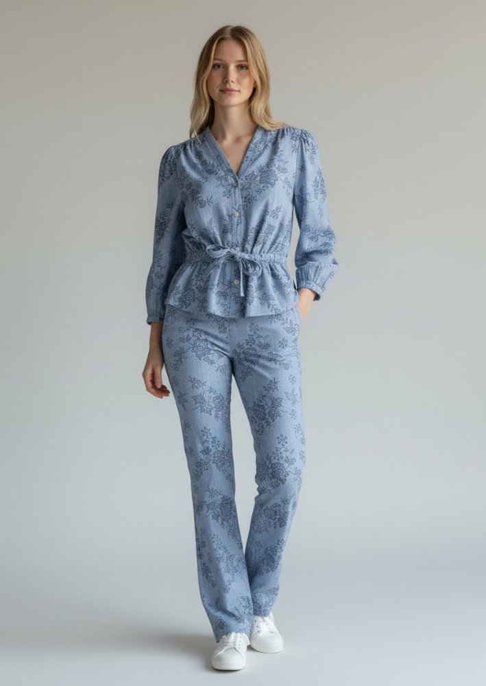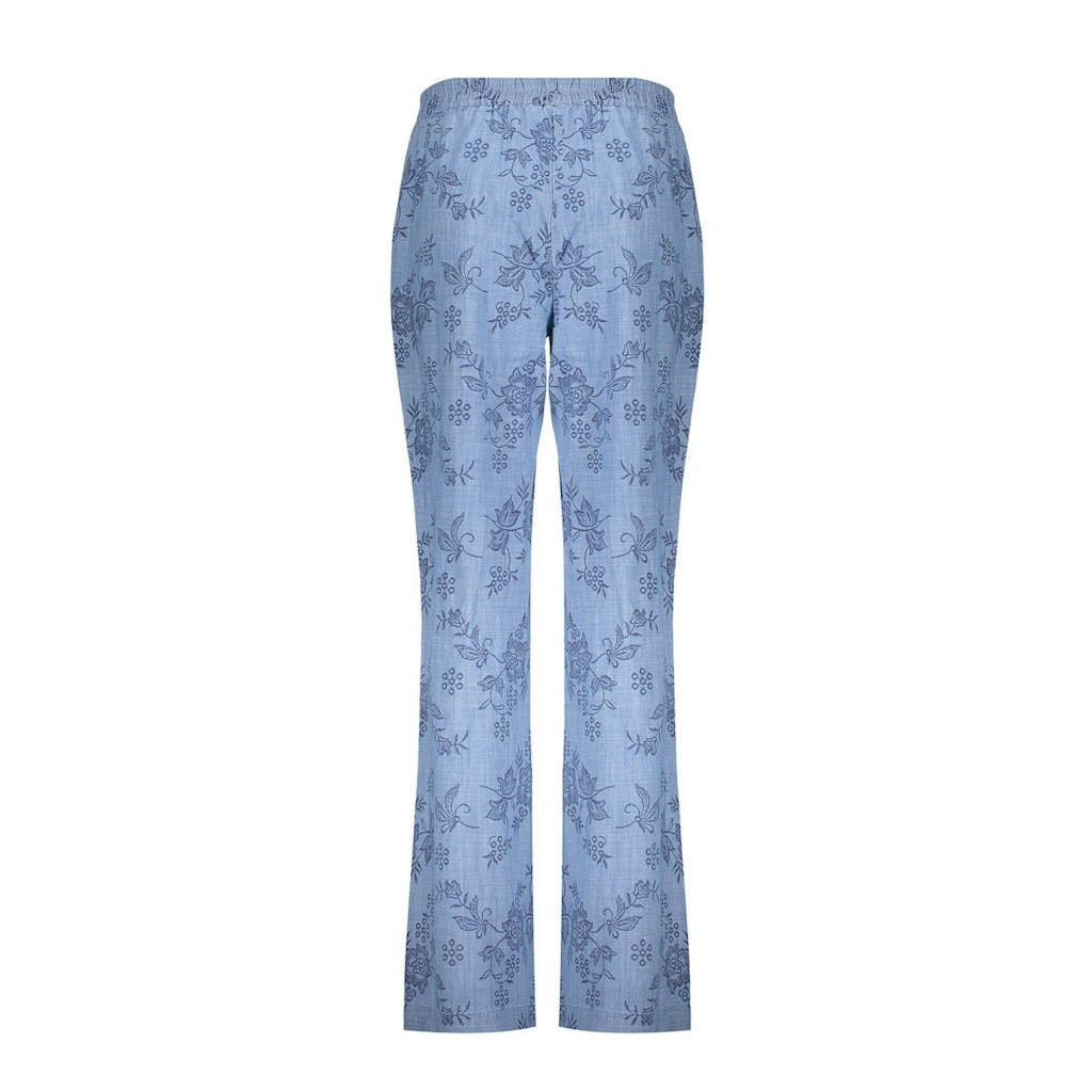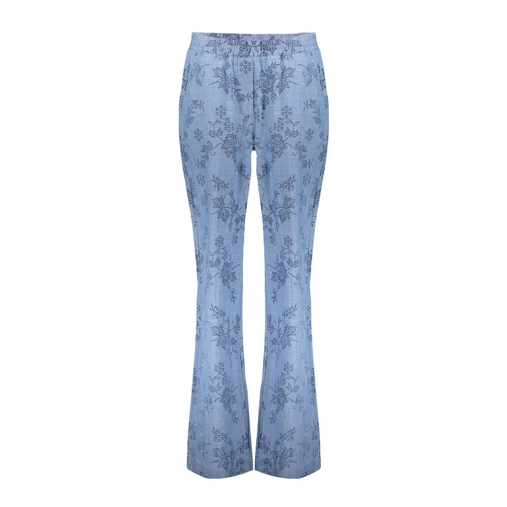 Geisha Broek in de Kleur Jeansblauw Combinatie met elastische band, steekzakken, geheel in een bloemprint in Blauw en iets uitlopend vanaf de knieën.