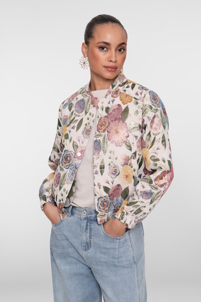Geisha Jasje in de Kleur Zand Combinatie met staande kraag, knoopsluiting, lange mouwen en geheel in een bloemborduurprint.