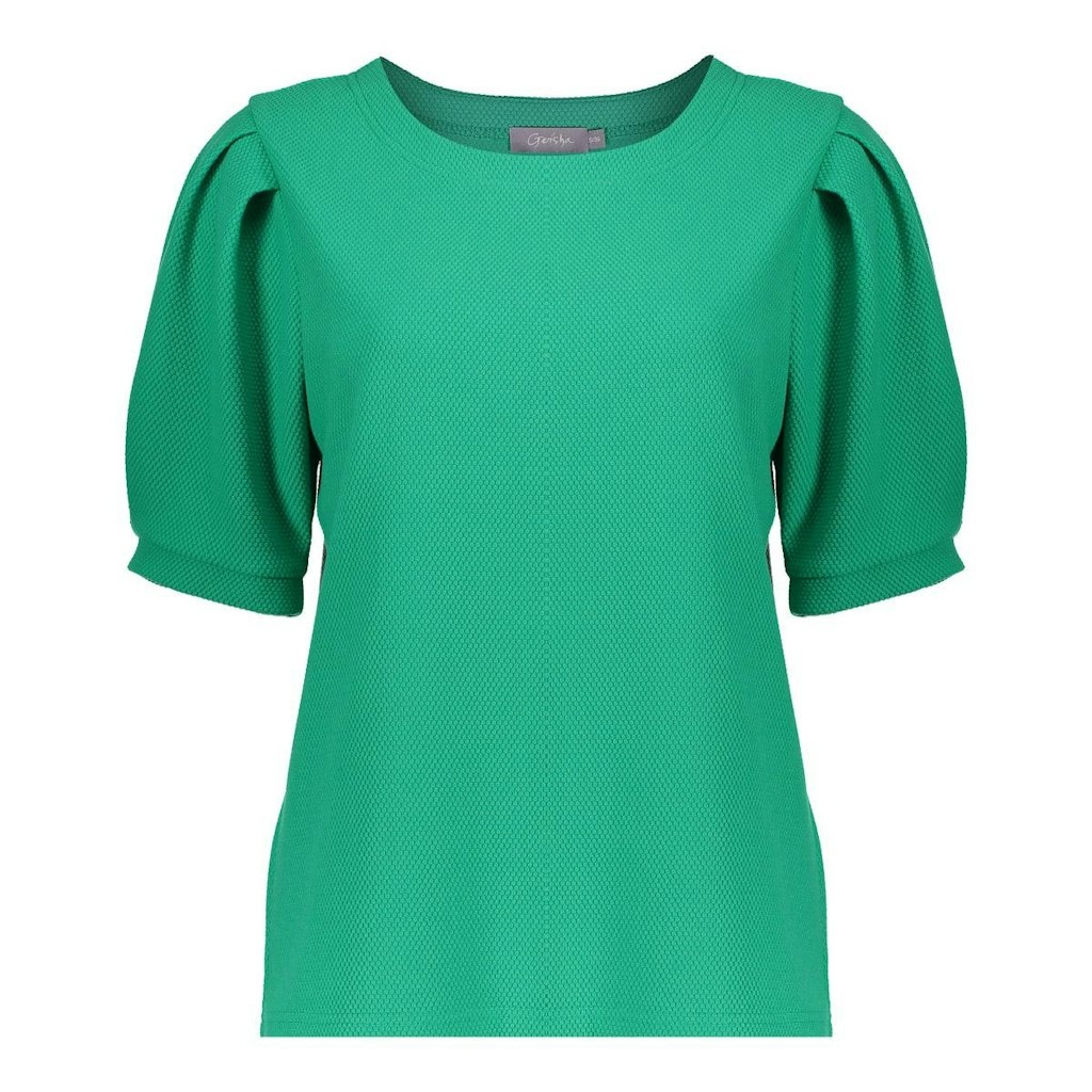 Geisha Pullover in de Kleur Groen met ronde hals, korte mouwen met leuke plooilijn vanaf de schouder.