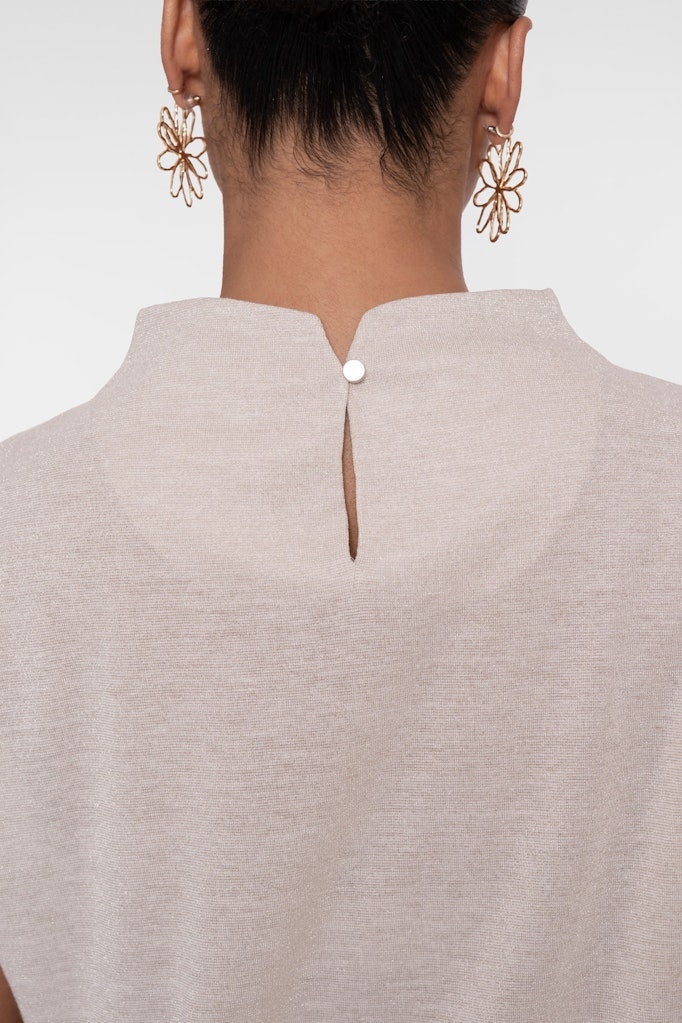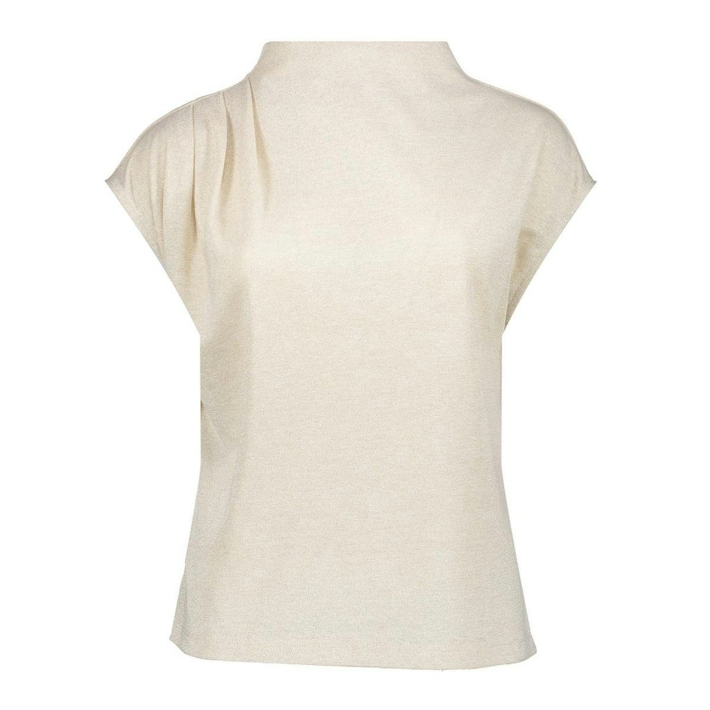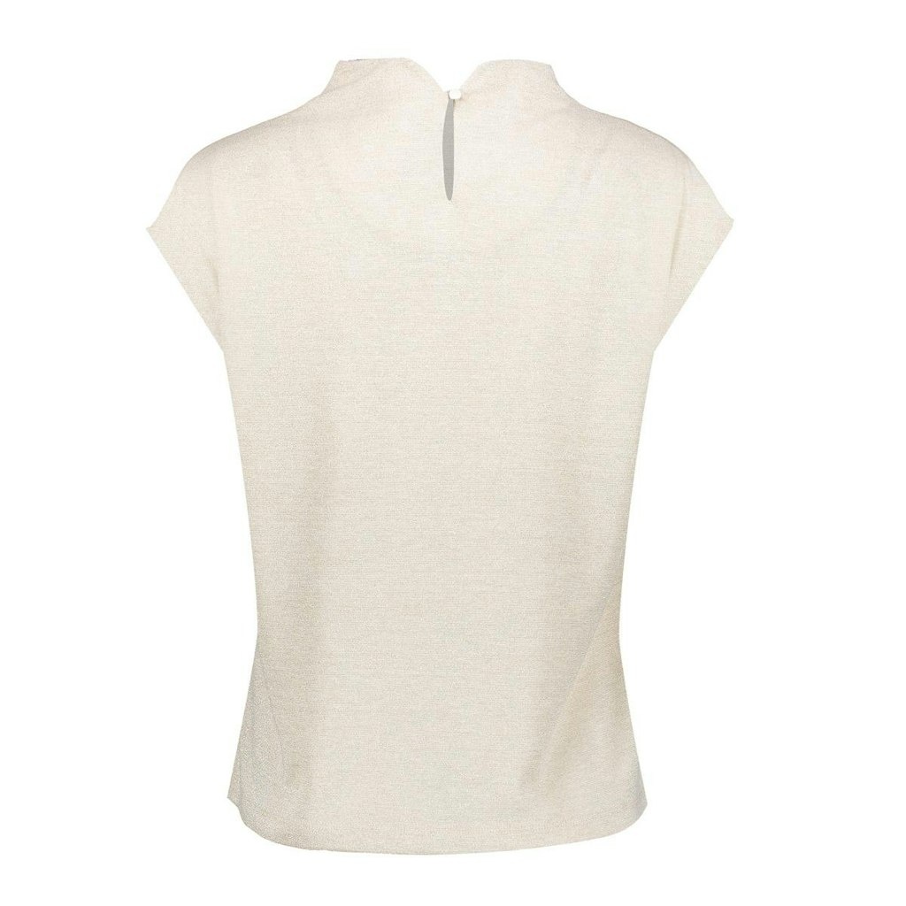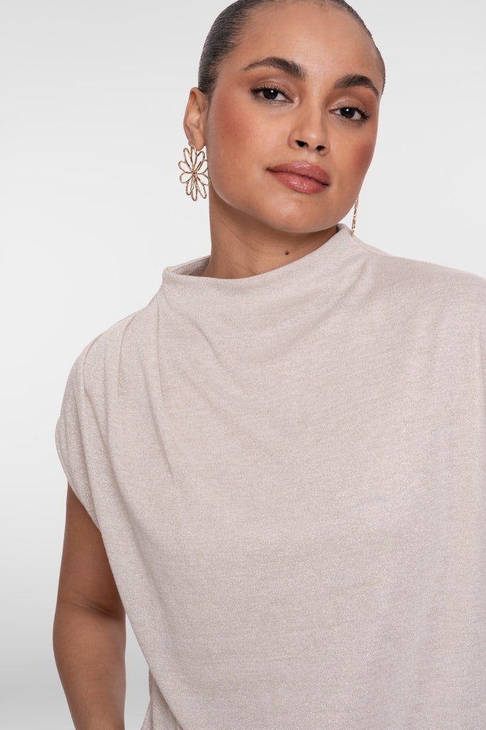 Geisha Dunne Pullover in de Kleur Zand/Goud met staande hals, kapmouwen met plooiverwerking en geheel voor zien van een gouden lurexglitter. Maakt deze pullover levendig.