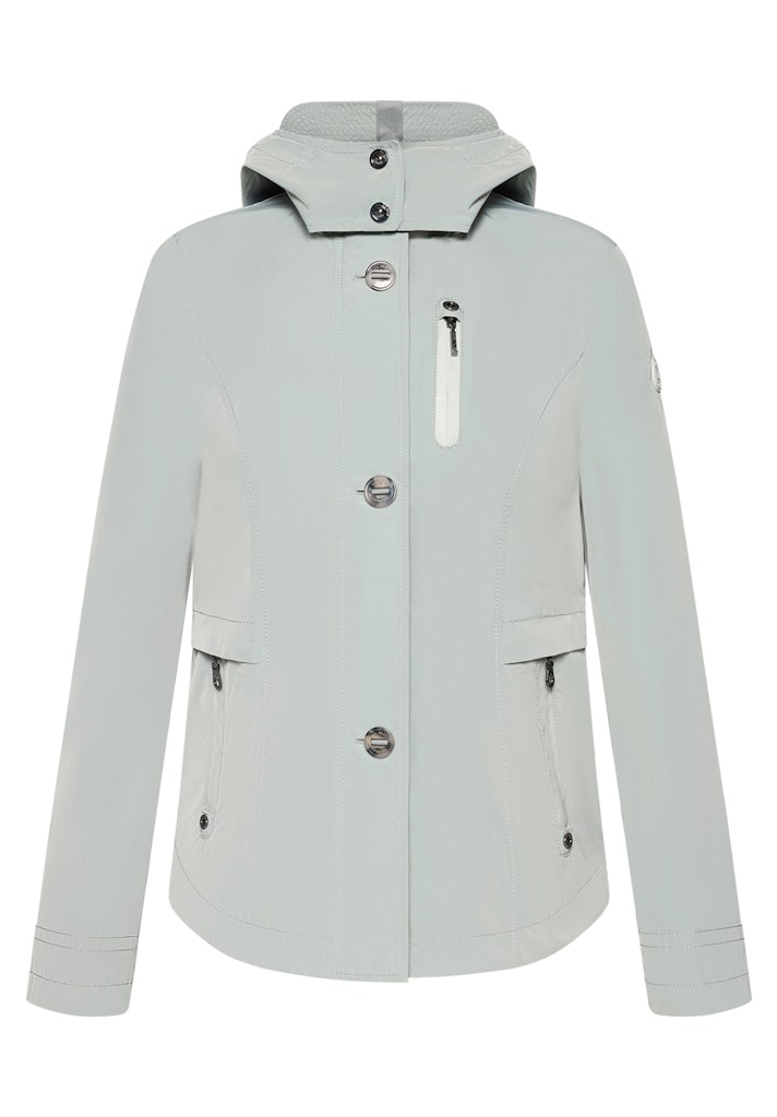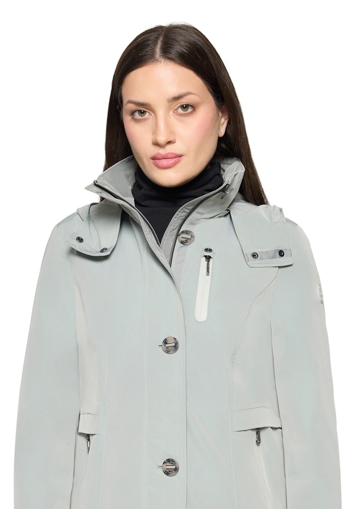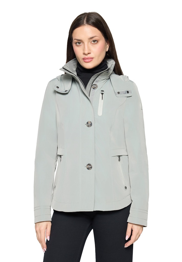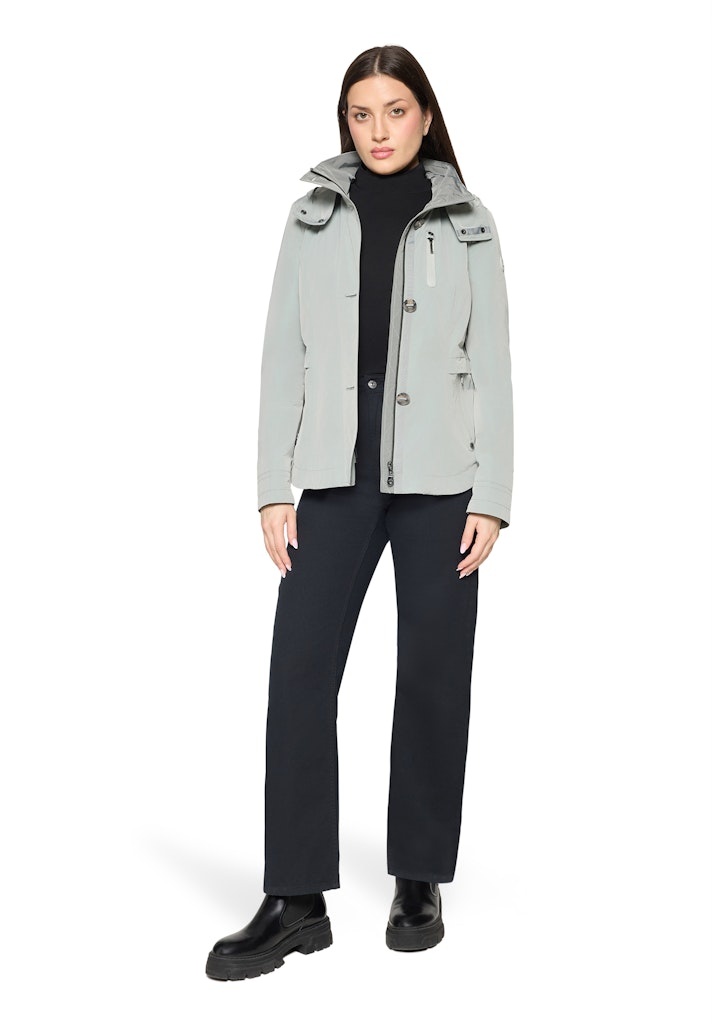 Gil Bret Jack in de Kleur Olijf met staande kraag, afneembare capuchon, ritssluiting. ritszakken, Weather Protected ofwel wind en waterafstotend. Dit jack kan tegen een goede regenbui en ademt. De Lengte is 64 cm.