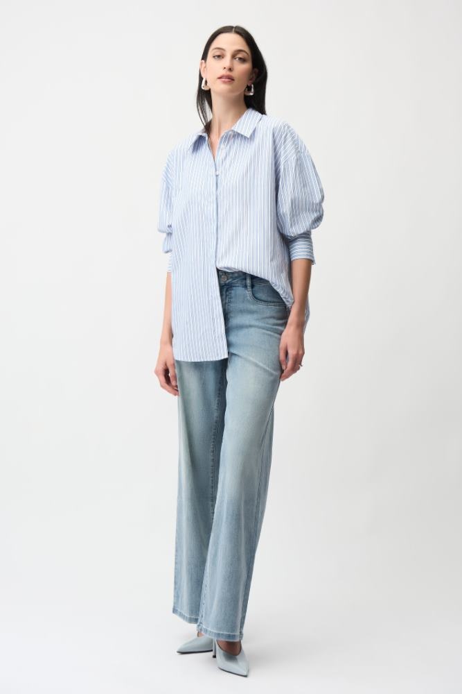 Joseph Ribkoff Blouse in de Kleur Blauw/wit gestreept met kraag, Blinde knoopsluiting, Lange mouwen met manchetten, rondgesneden aan de onderkant, langer model en geheel met kleine strassteentjes.
