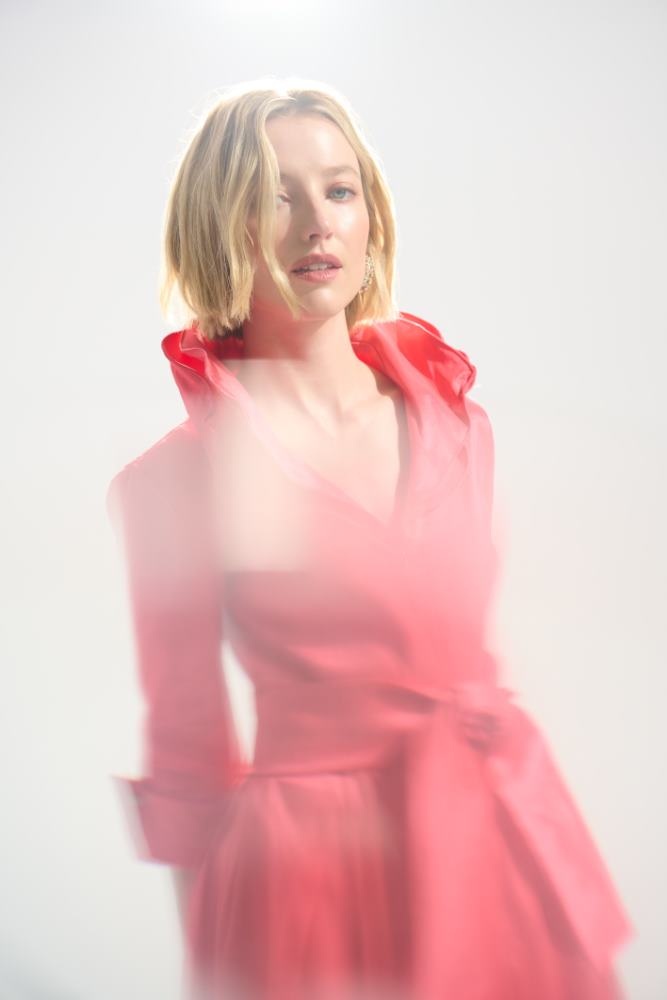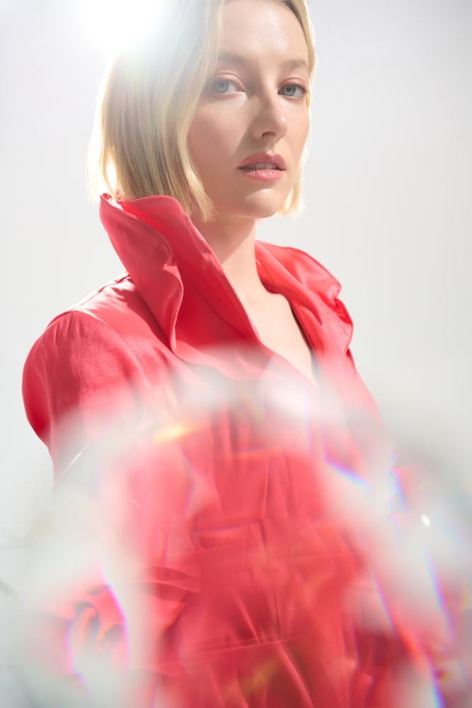 Joseph Ribkoff Jurk in de Kleur Koraal, Prachtige Jurk in een prachtige taft kwaliteit met bewerkbare kraag, kleine rits aan de voorkant, grotere strik en prachtig glad en aansluitend op de rug.