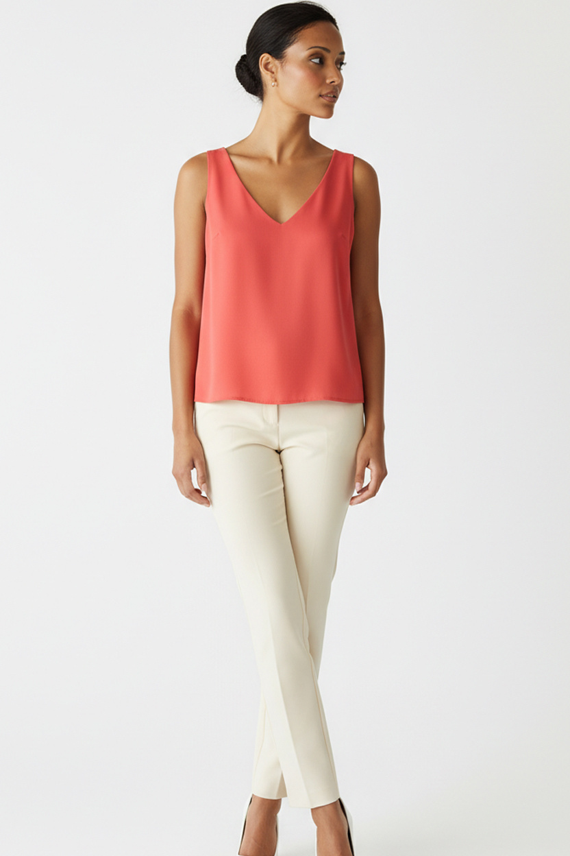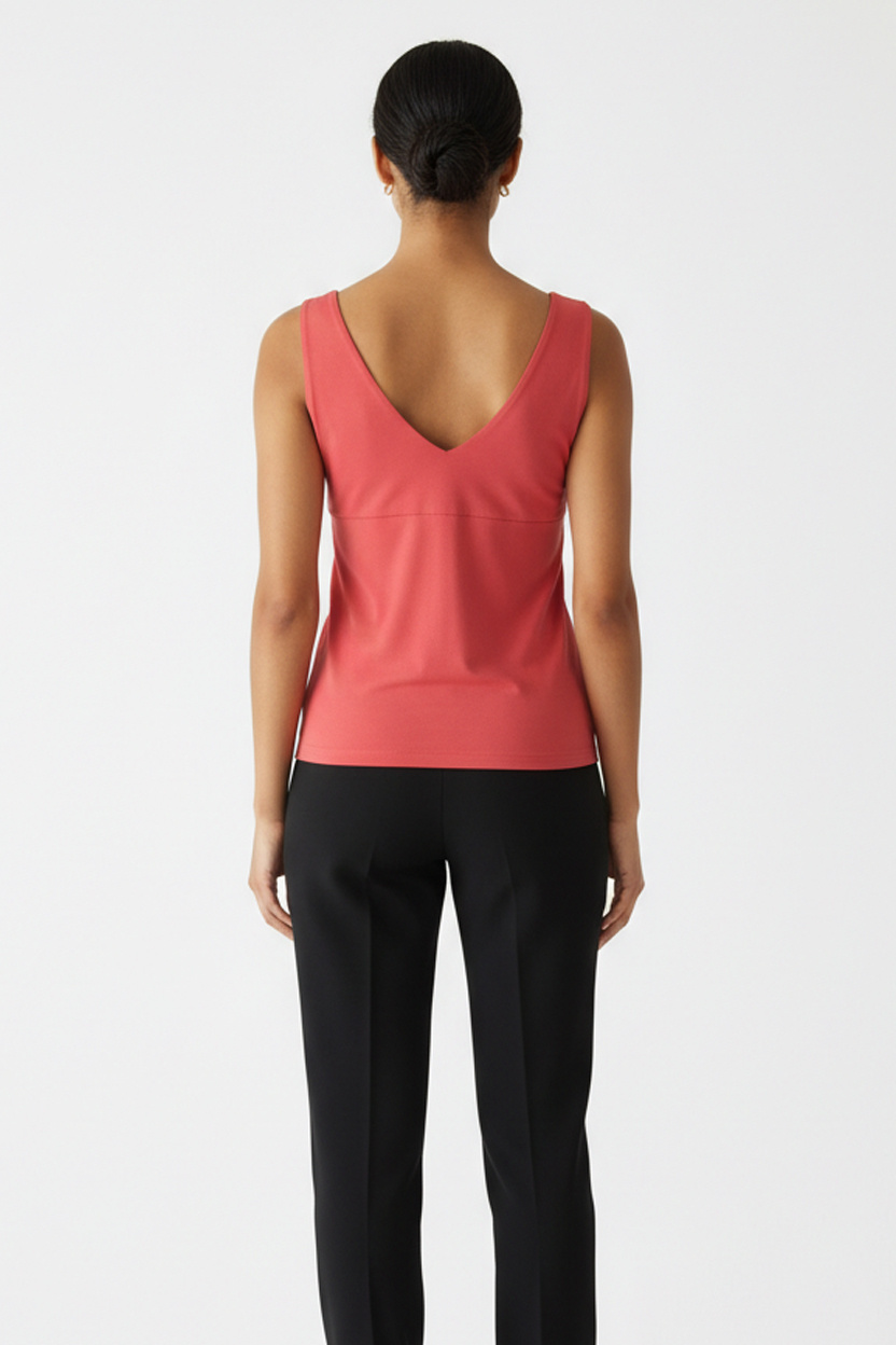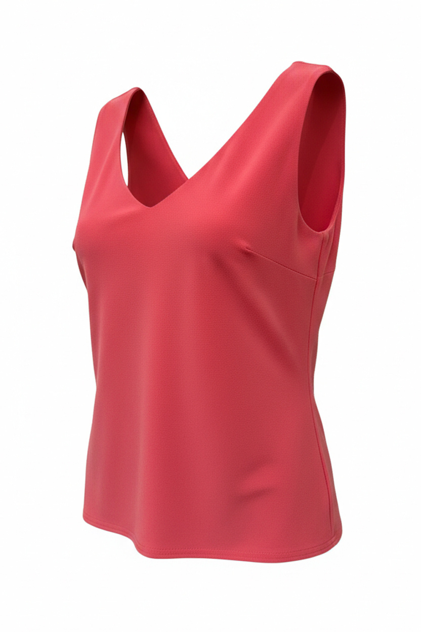 Joseph Ribkoff Top in de Kleur Koraal met ronde V hals.