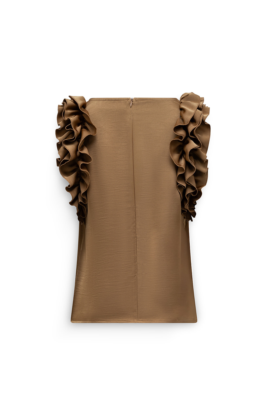 Label Dot Blouse in de Kleur Hazelnoot met ronde hals, mouwloos en grote rush rond de mouwlijn.