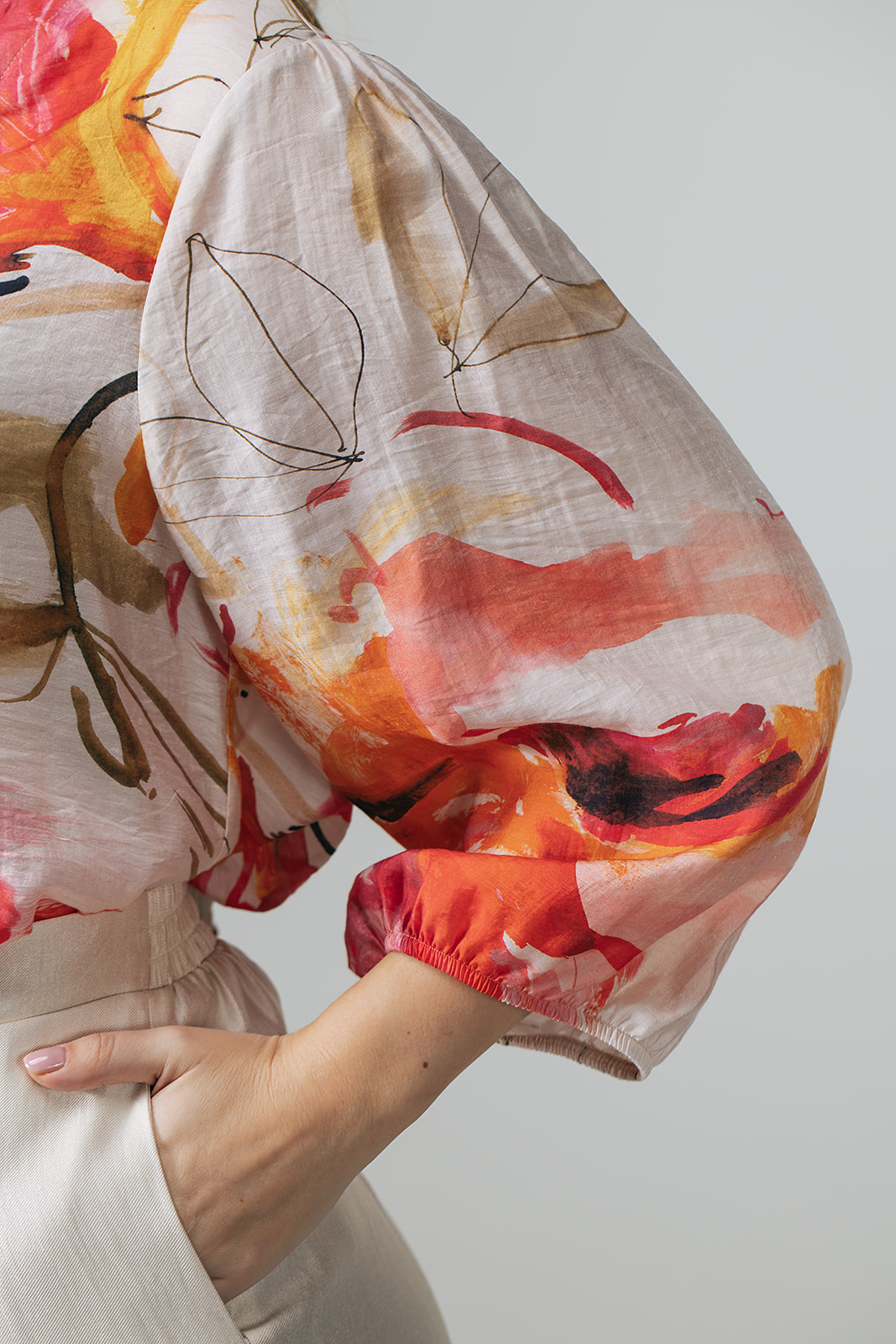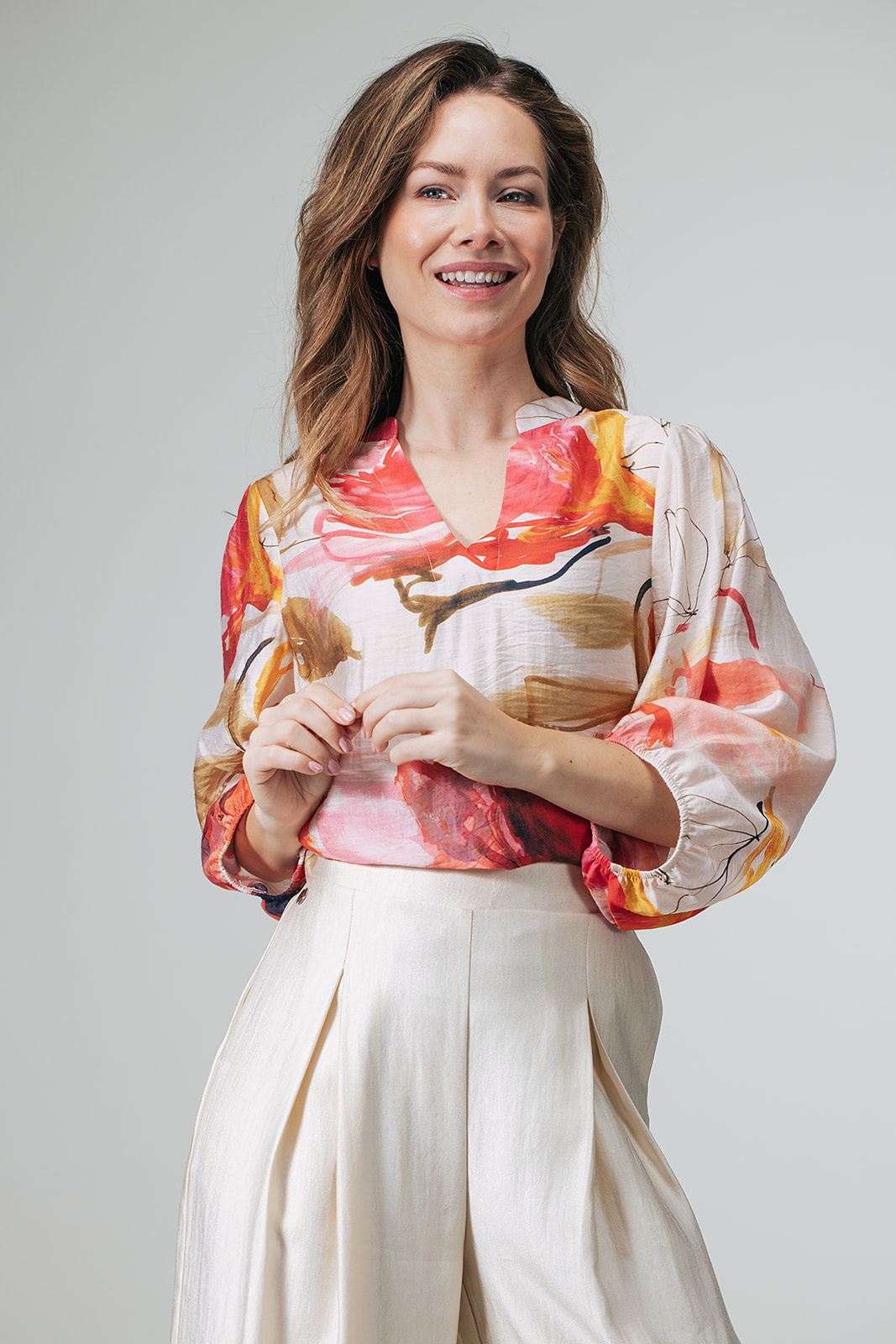 Label Dot Blouse in de Kleur Ivoor/Rood/Pink Combinatie met staande hals en V inzet, 3/4 mouwen en geheel in een waterverfprint.