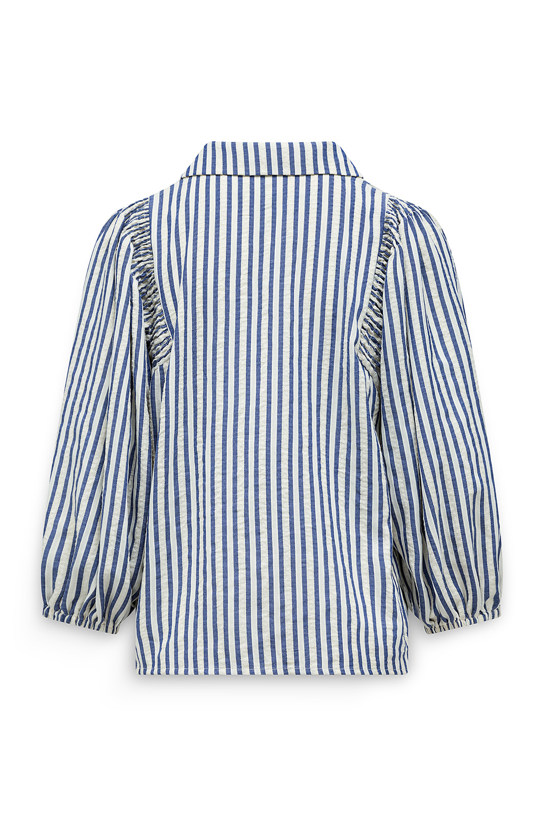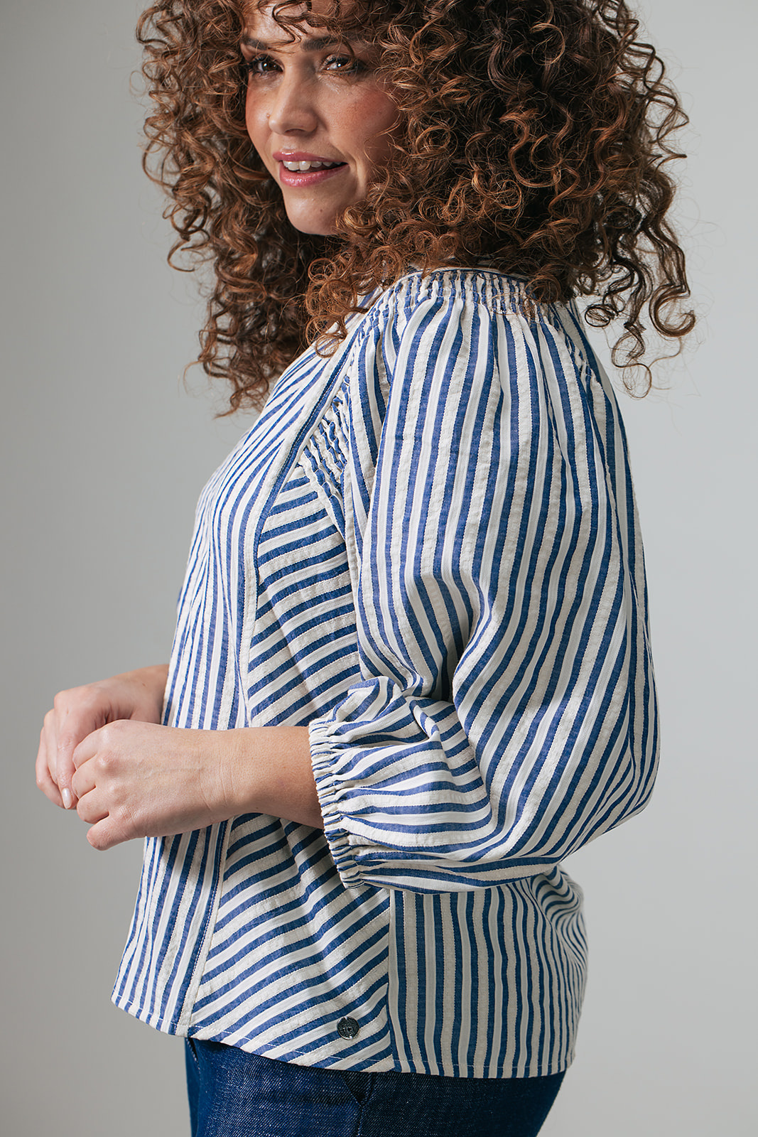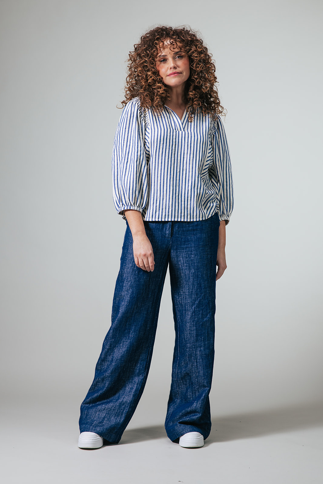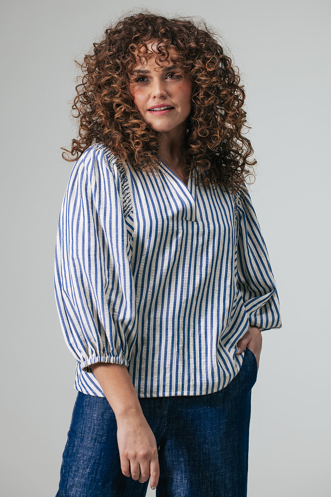 Label Dot Blouse in de Kleur Marine Combinatie gestreept met kraag, V inzet, 3/4 mouwen en in een prachtige linnenlook.
