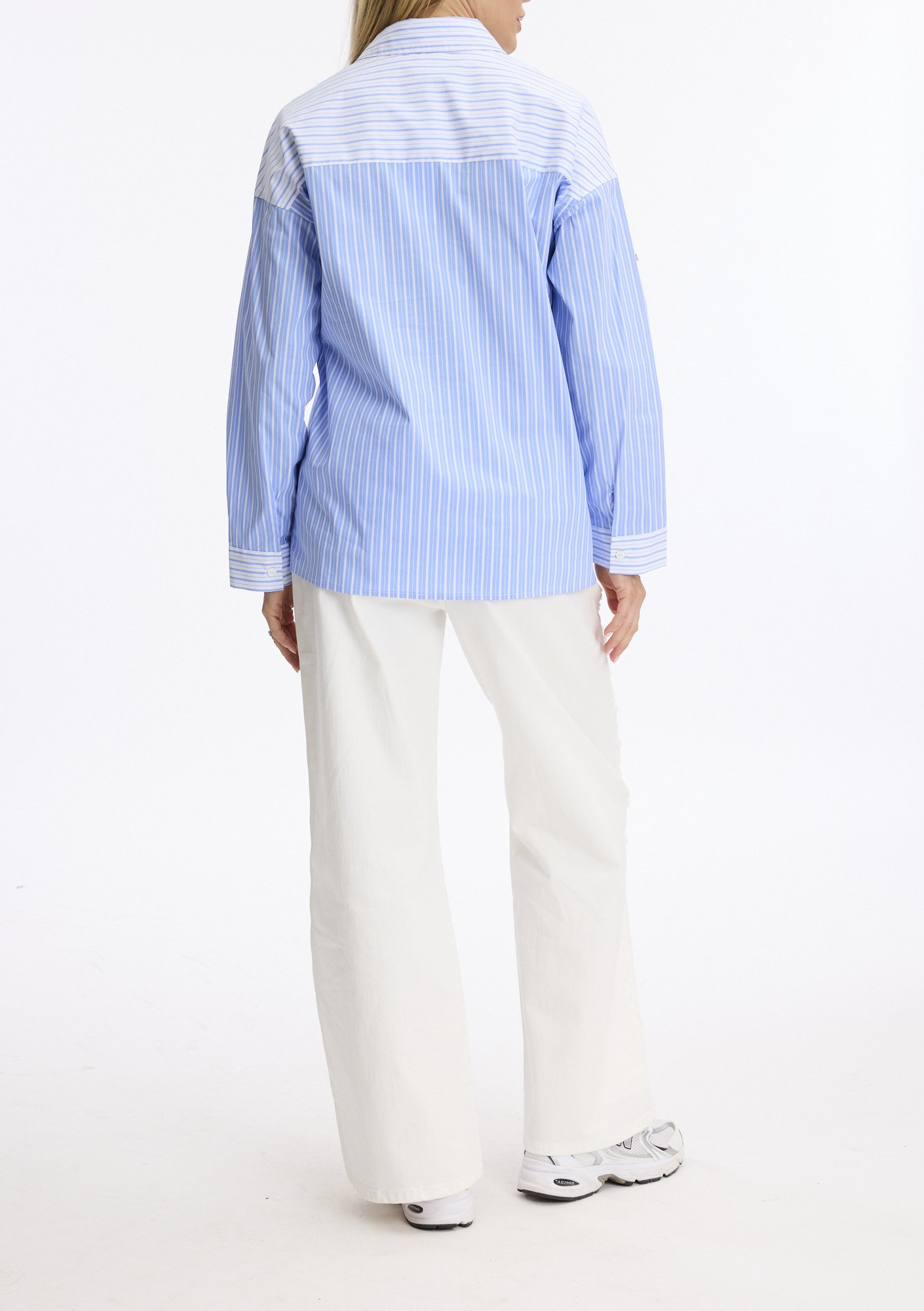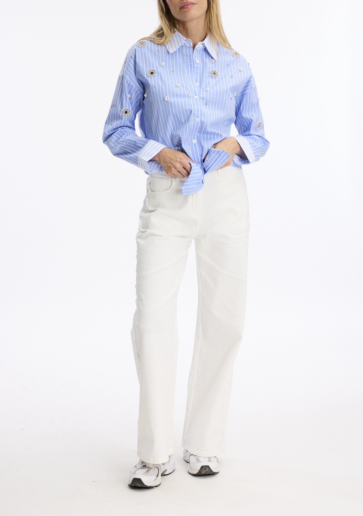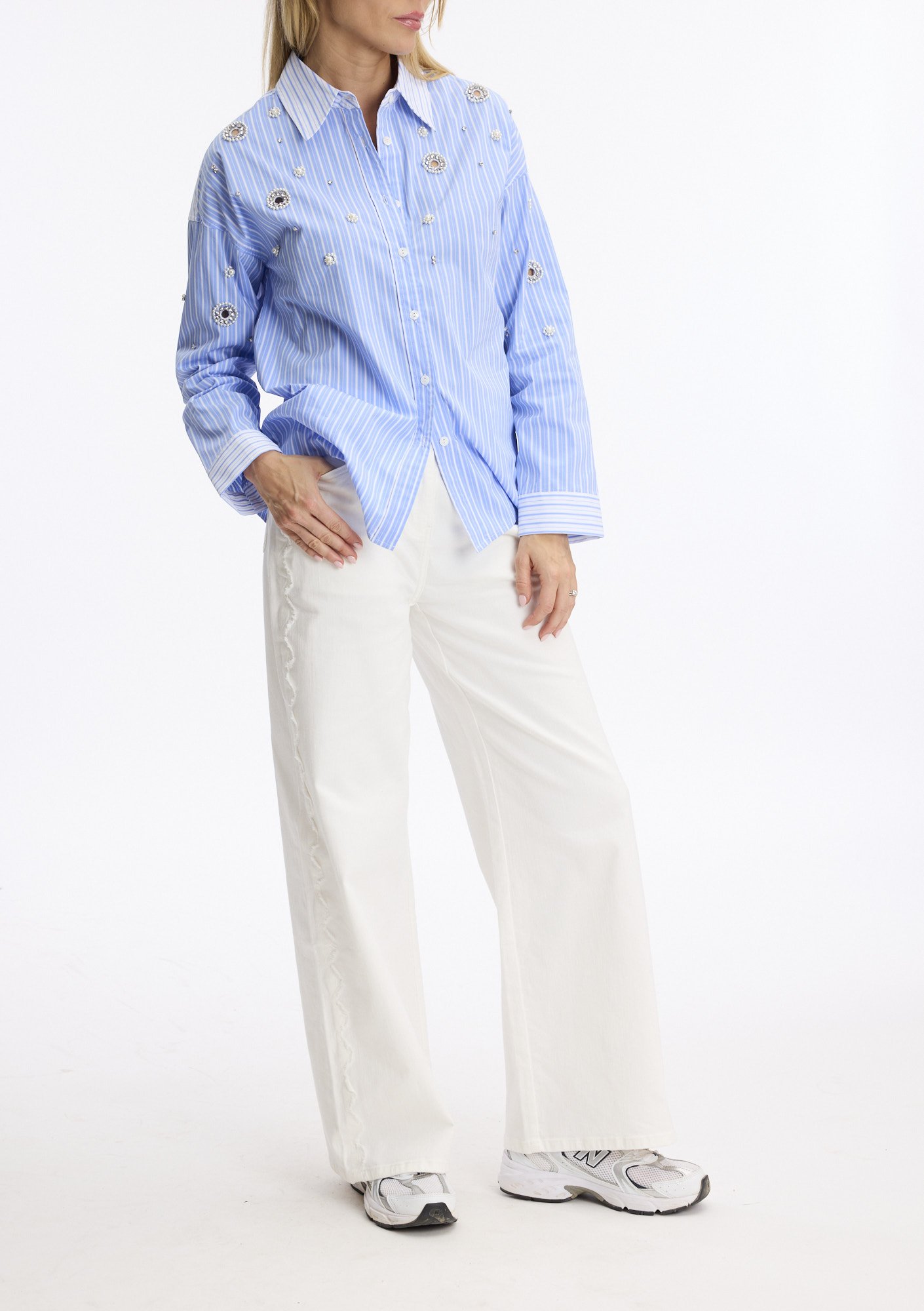 Leo & Ugo Blouse in de Kleur Blauw/Wit gestreept met kraag, doorknoopsluiting, lange mouwen en met kleine en grote strasssteentjes.