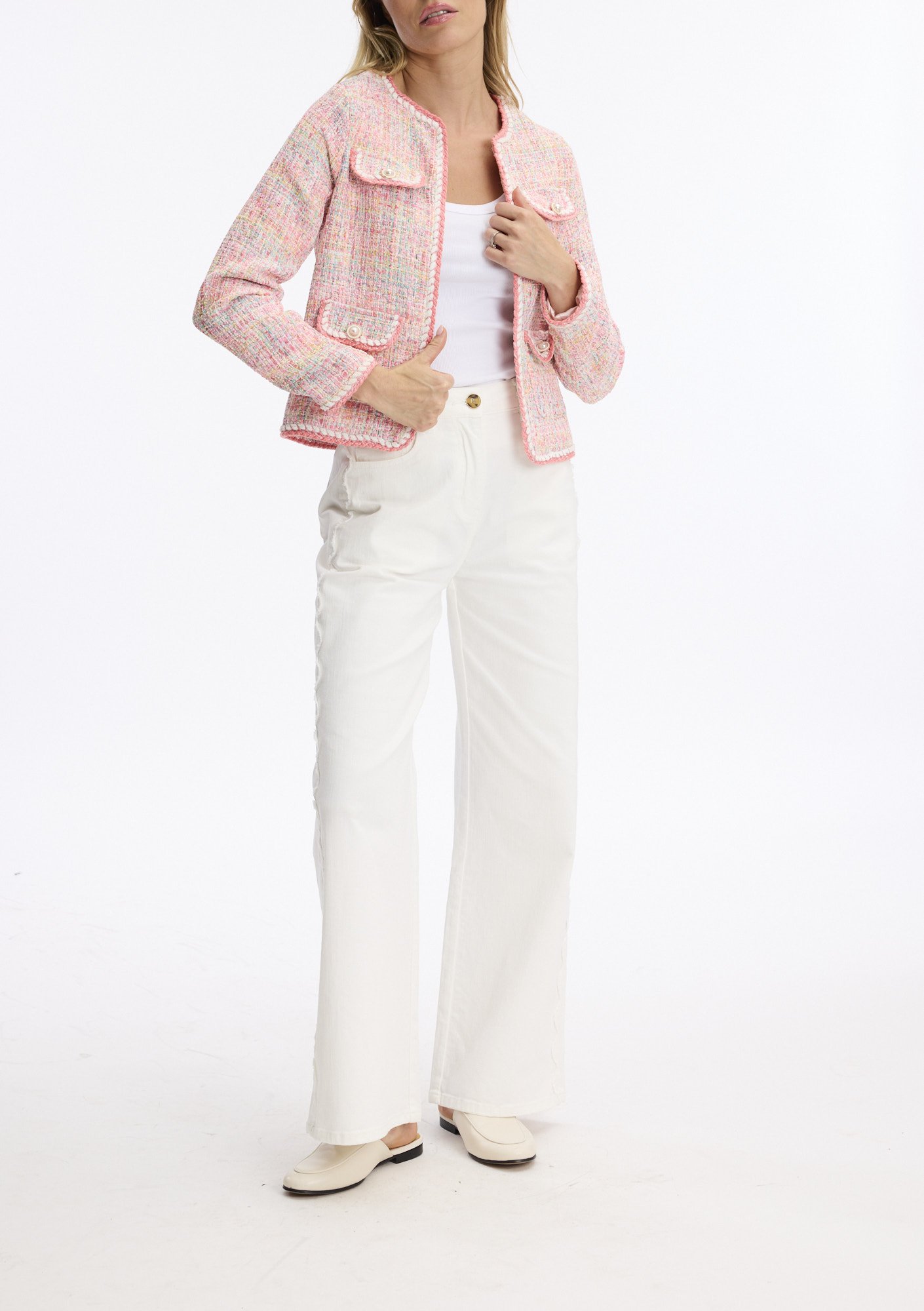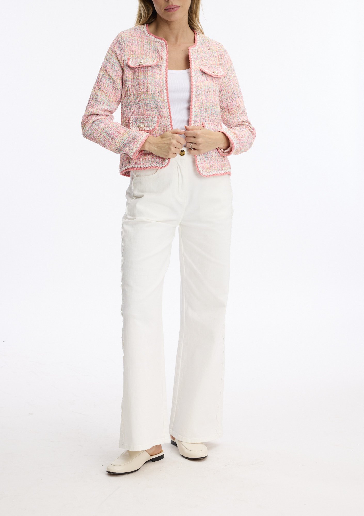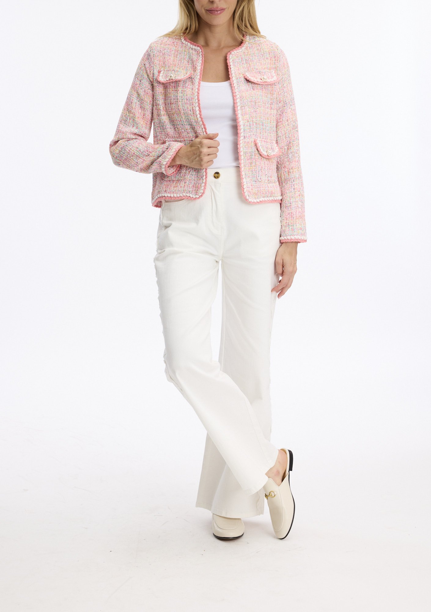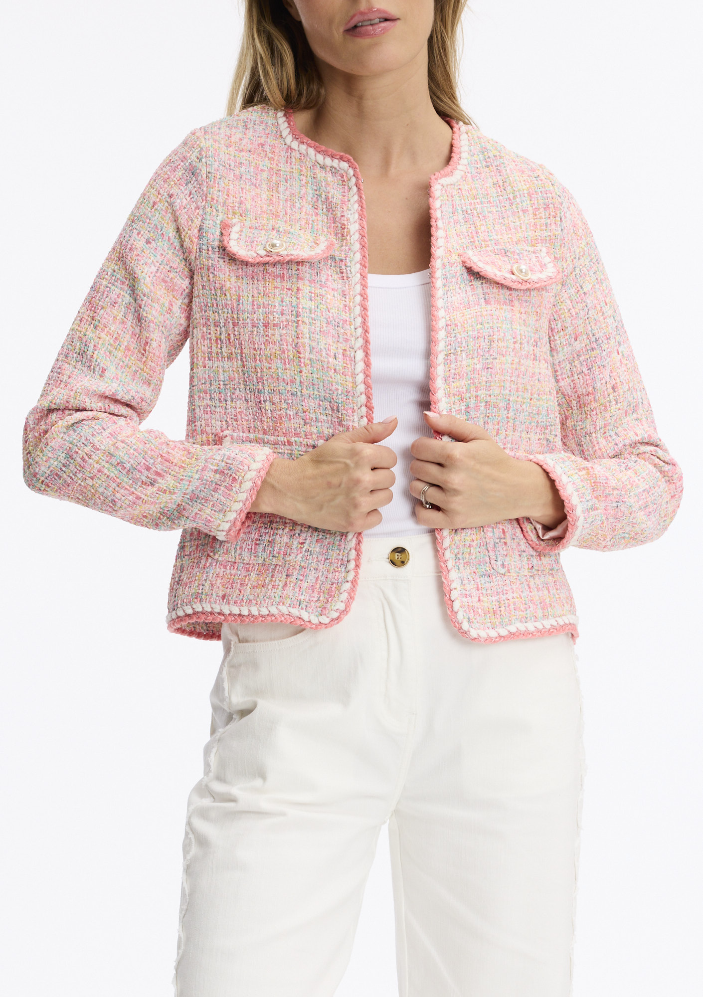 Leo & Ugo "chanel" Jasje in de Kleur Rose Combinatie met ronde hals met bies langs de rand van het jasje, klepzakken en Lange mouwen.