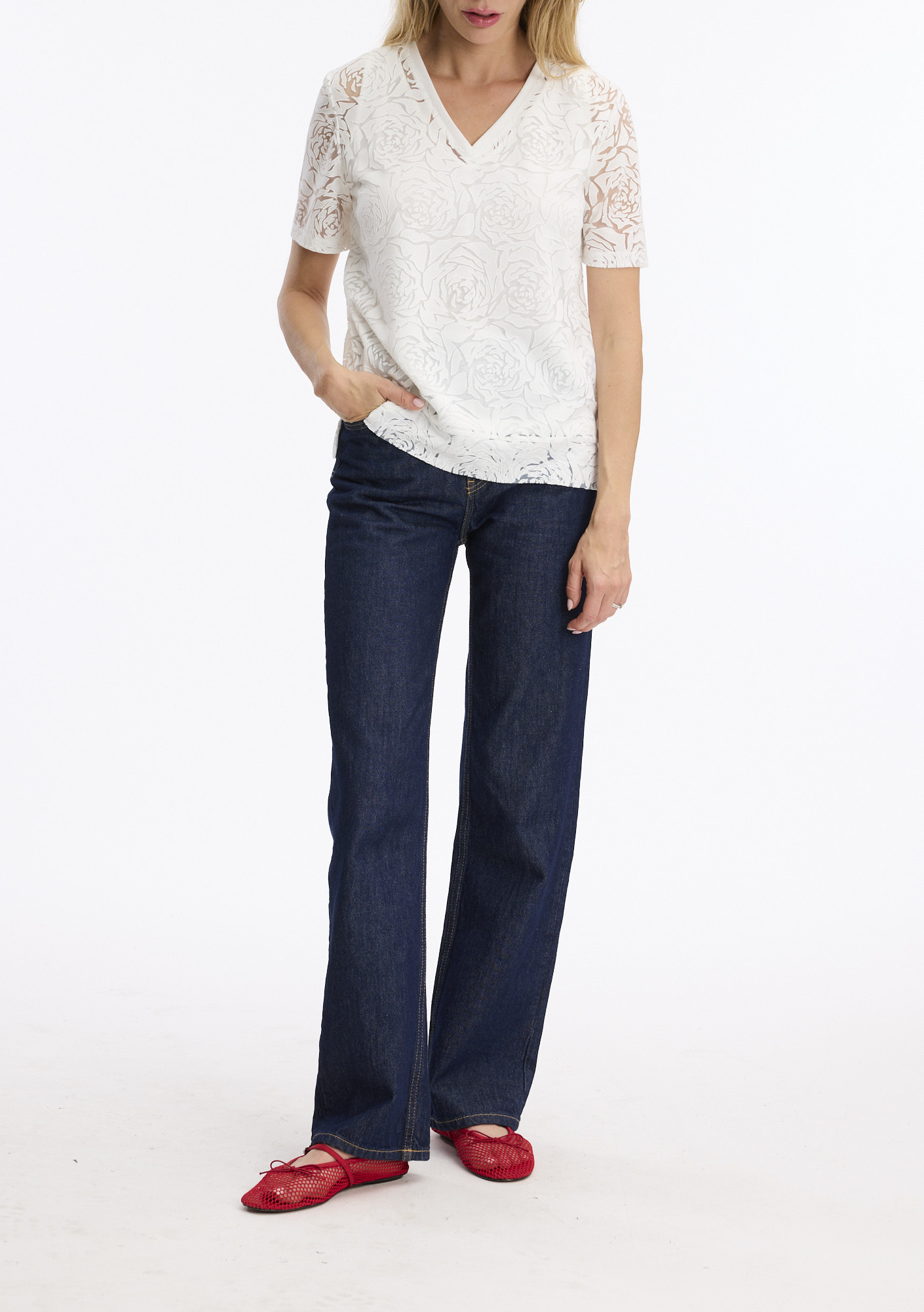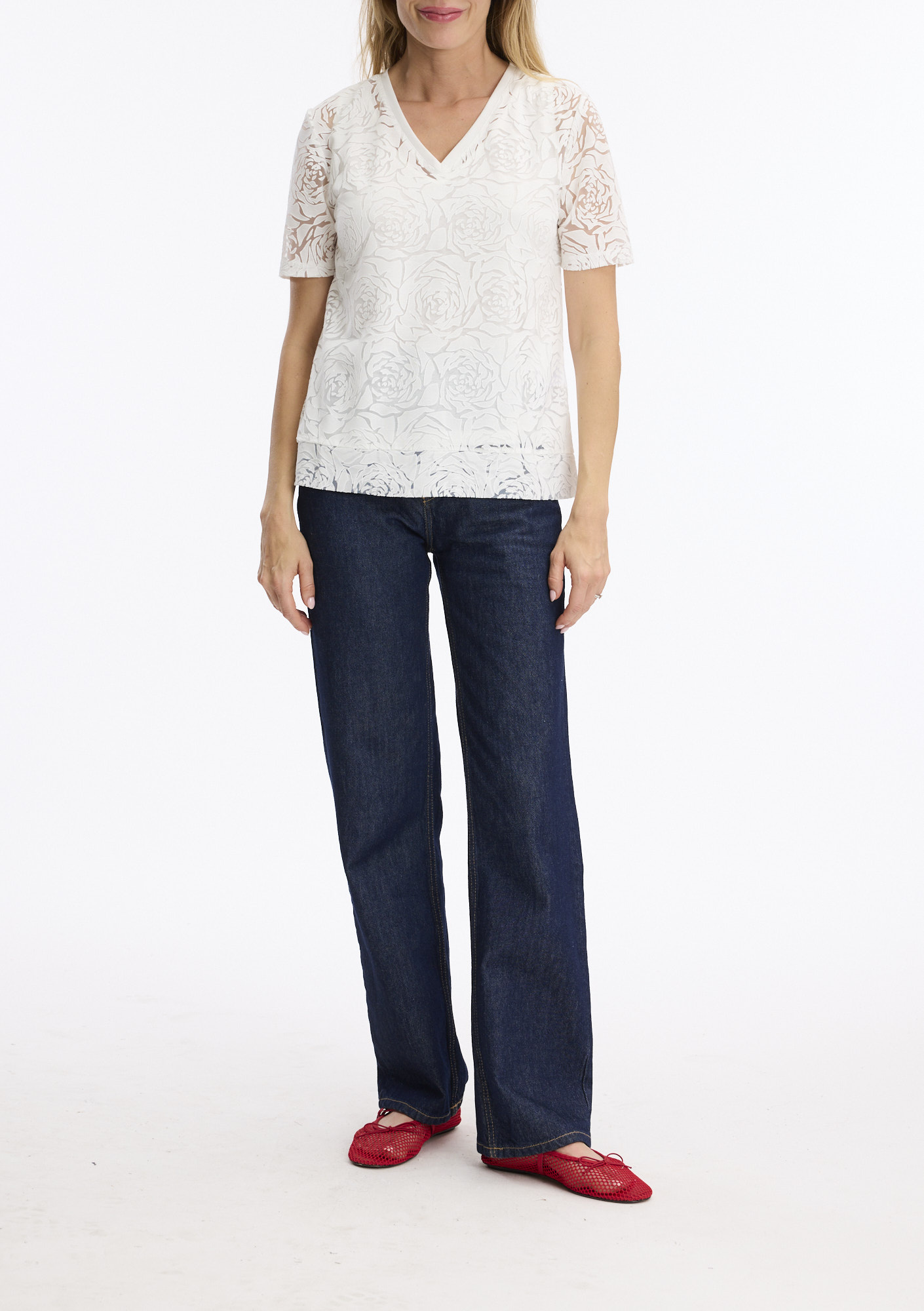 Leo & Ugo Shirt in de Kleur Offwhite met V hals, korte mouwen met transparante Roos en losse tricot top.